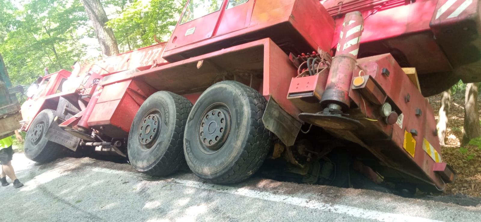Průzkumem na místě hasiči zjistili, že se střetl osobní automobil značky Škoda, traktor s valníkem a automobilový jeřáb. Hasiči prověřili únik provozních kapalin. Byl zjištěn únik hydraulické kapaliny z jeřábu, který hasiči ihned začali jímat. Následně vyčkali do příjezdu dalšího jeřábu, který havarovaný jeřáb i traktor vyprostil. Jednotka zásah ukončila po 16. hodině.