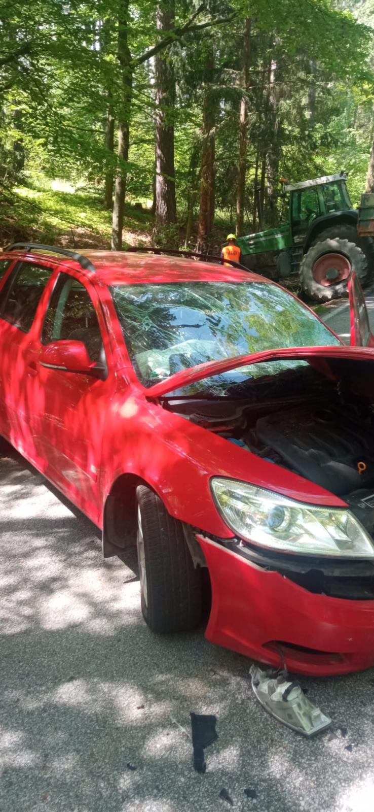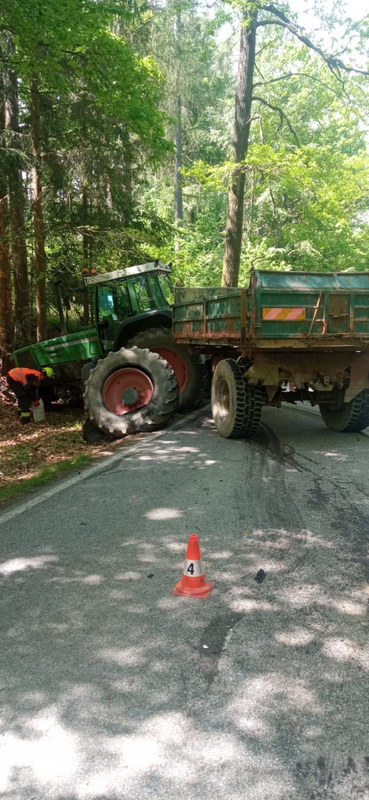 Nehoda traktoru, jeřábu a osobního auta u Hosína