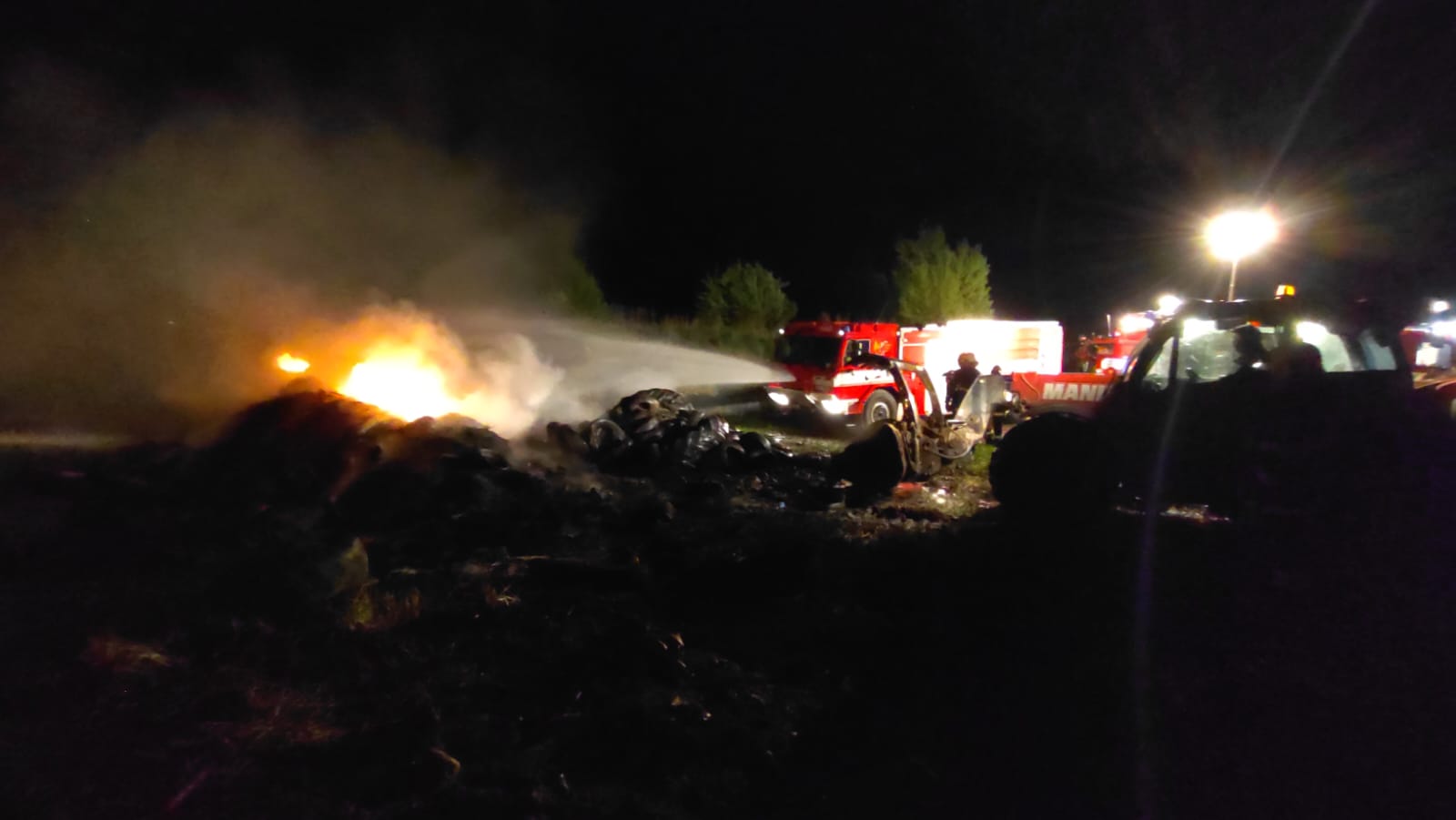 Průzkum ukázal, že v areálu místního zemědělského družstva hoří hromada pneumatik používaných k zatěžkávání a že požár se rozšířil na pytle plastového odpadu. Ty shořely úplně, pneumatiky v době příjezdu hasičů hořely intenzivně plamenným hořením. Plocha požáru byla odhadnuta na 20 x 15 metrů, pneumatiky byly naskládány do výšky přibližně 2,5 metru. Hořící skládka se nacházela na kraji areálu družstva v blízkosti pole, požár neohrožoval žádné budovy ani porosty. Kouř, který šel z hořících pneumatik, nešel směrem na obec, takže ani nebylo nutné přijímat opatření vzhledem k obyvatelstvu.