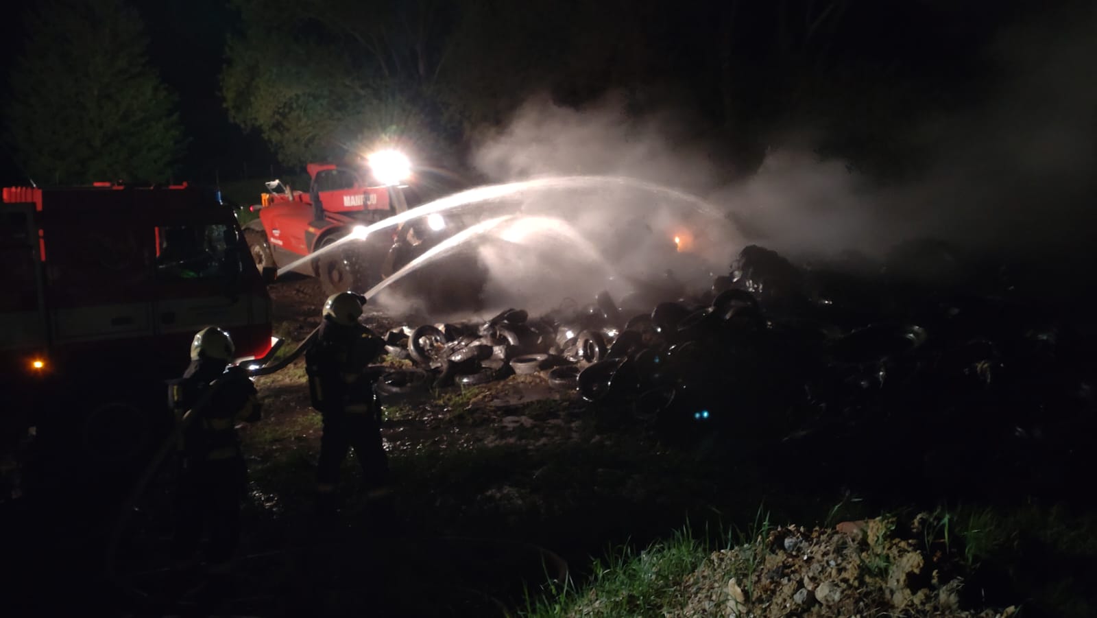 Zasahujícím hasičům se nasazením několika proudů podařilo požár za necelou hodinu zredukovat na plochu 10 x 8 metrů. Lokalizace požáru byla nahlášena v 1:31 hodin. Plastové pytle shořely kompletně, již jen doutnající pneumatiky byly místním manipulátorem rozváženy a postupně dohašovány.