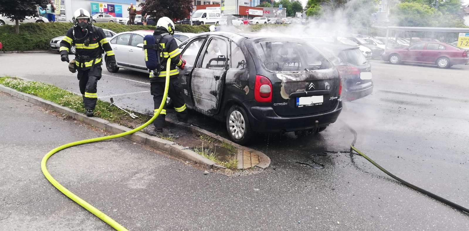 V plném rozsahu hořelo již osobního auto, když k němu krátce před polednem na parkoviště k hypermarketu v Chýnovské ulici v Táboře přijela místní profesionální jednotka.