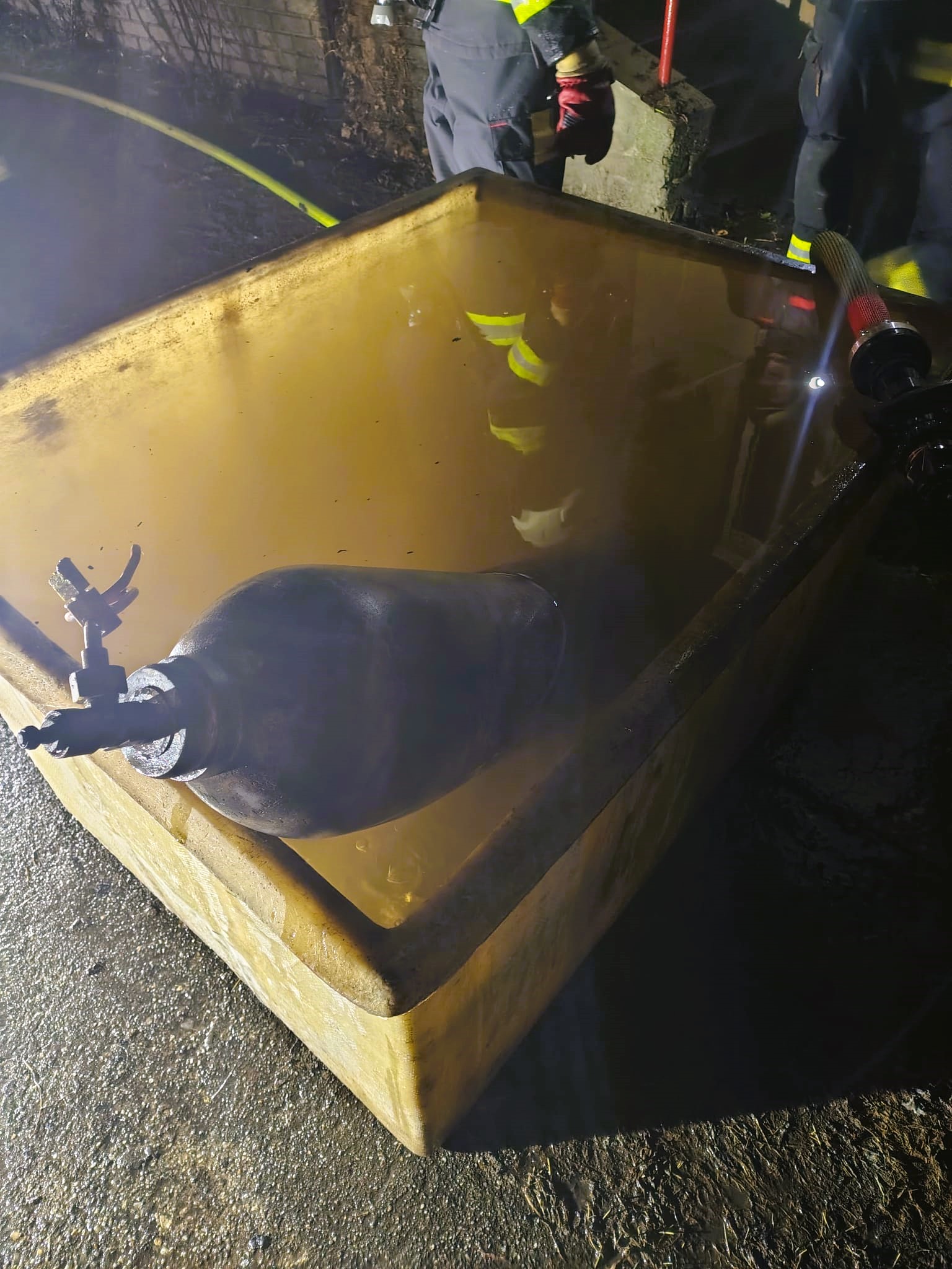 Mezitím hasiči dokončovali zajištění nebezpečné látky. Hydraulickými nůžkami rozstřihli zadní dveře dodávky a přistoupili k dalšímu ochlazování tlakové lahve. Teprve když dosáhla bezpečné teploty 10 °C, byla přeložena do speciální vodní lázně, kde bude pod dohledem ještě dalších 24 hodin.