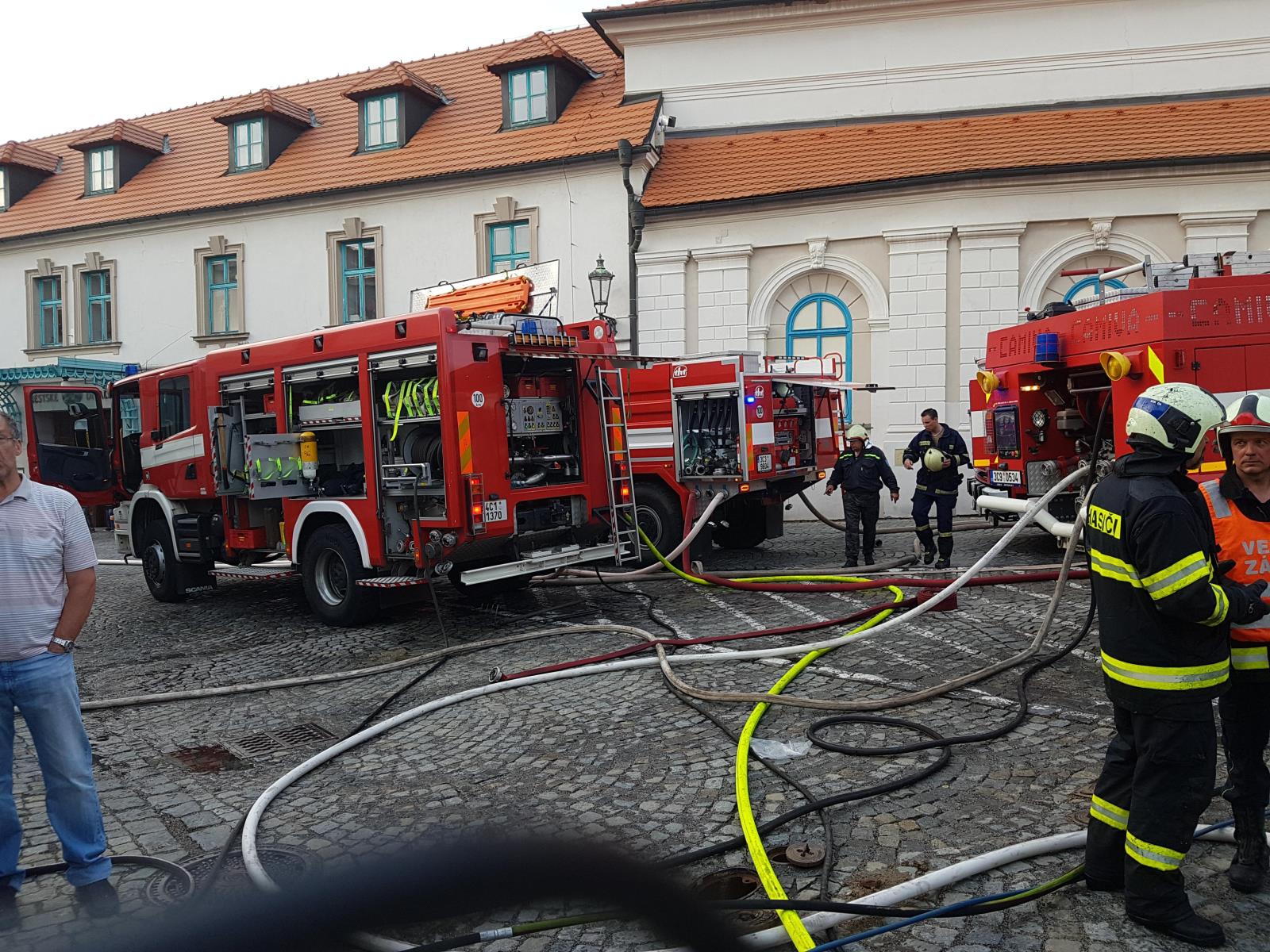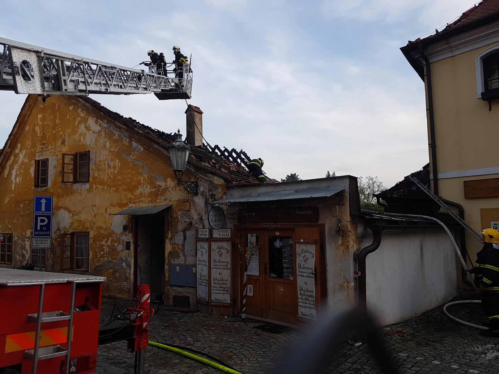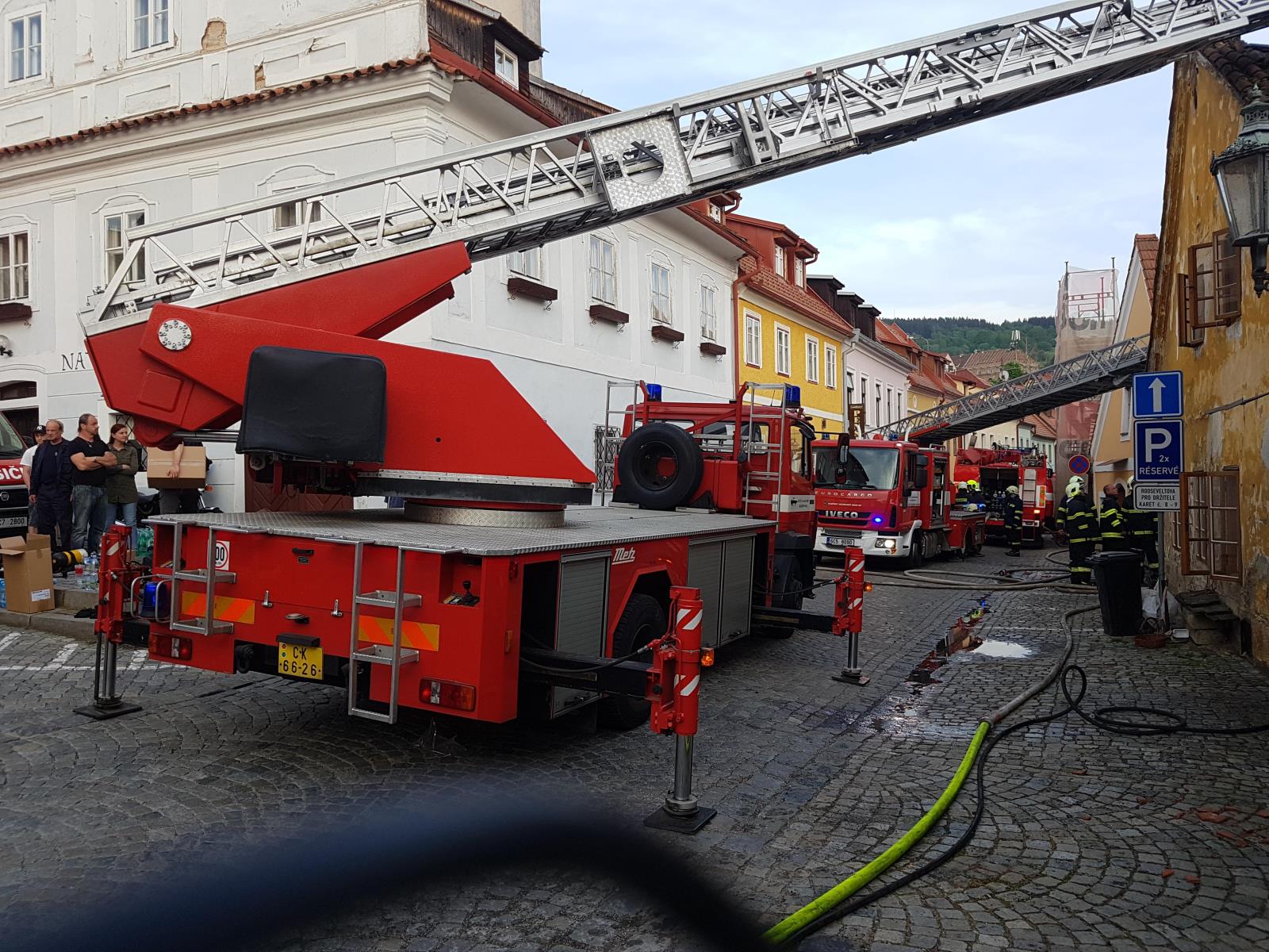 K požáru v 16:30 hodin vyjeli včetně výškové techniky profesionální hasiči z českokrumlovské stanice, svolána byla českokrumlovská dobrovolná jednotka.