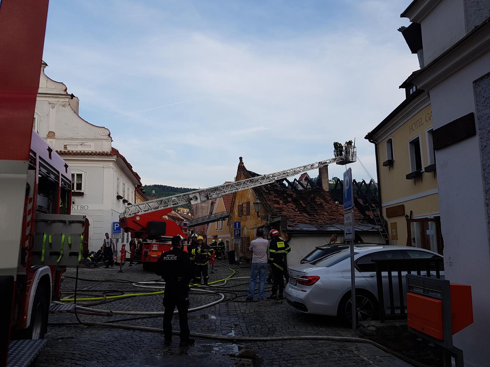 Ohnisko požáru bylo skutečně v kolně. Ta stála v těsné blízkosti hotelu a rodinného domu. Požár se z kolny rozšířil na oba směry a po fasádách domů se dostal až do střech. Ničil jak podkroví domů, tak celé střechy včetně krovů. Hasiči ihned zahájili hasební práce. V rámci průzkumu zjistili, že ani v jednom z domů nikdo není. Všichni se stihli samoevakuovat ještě před příjezdem jednotek. Nikdo nebyl zraněn.