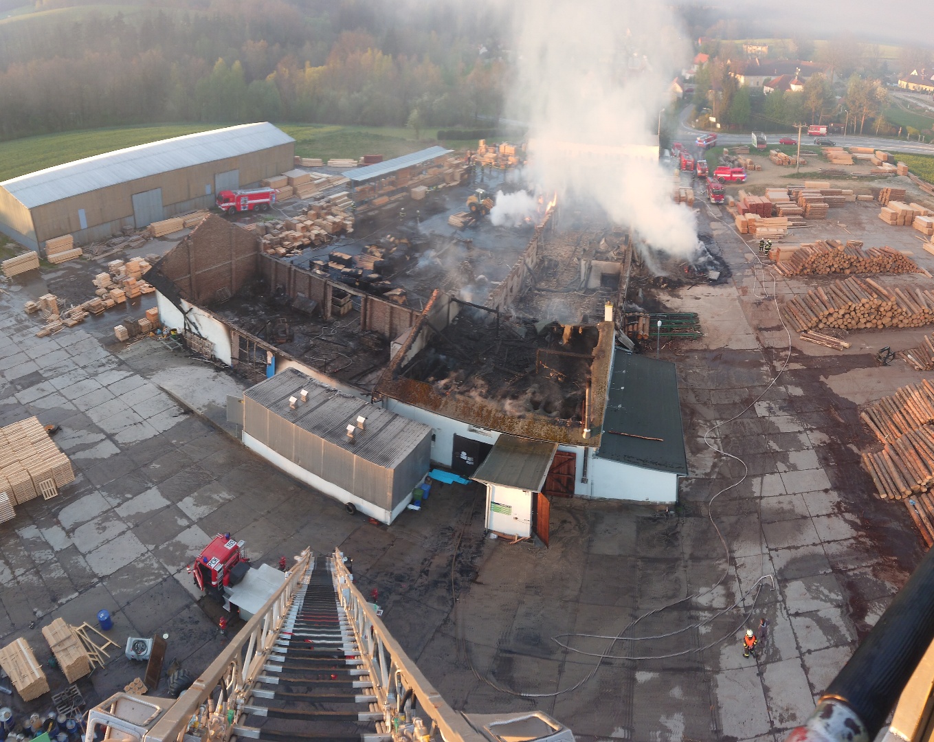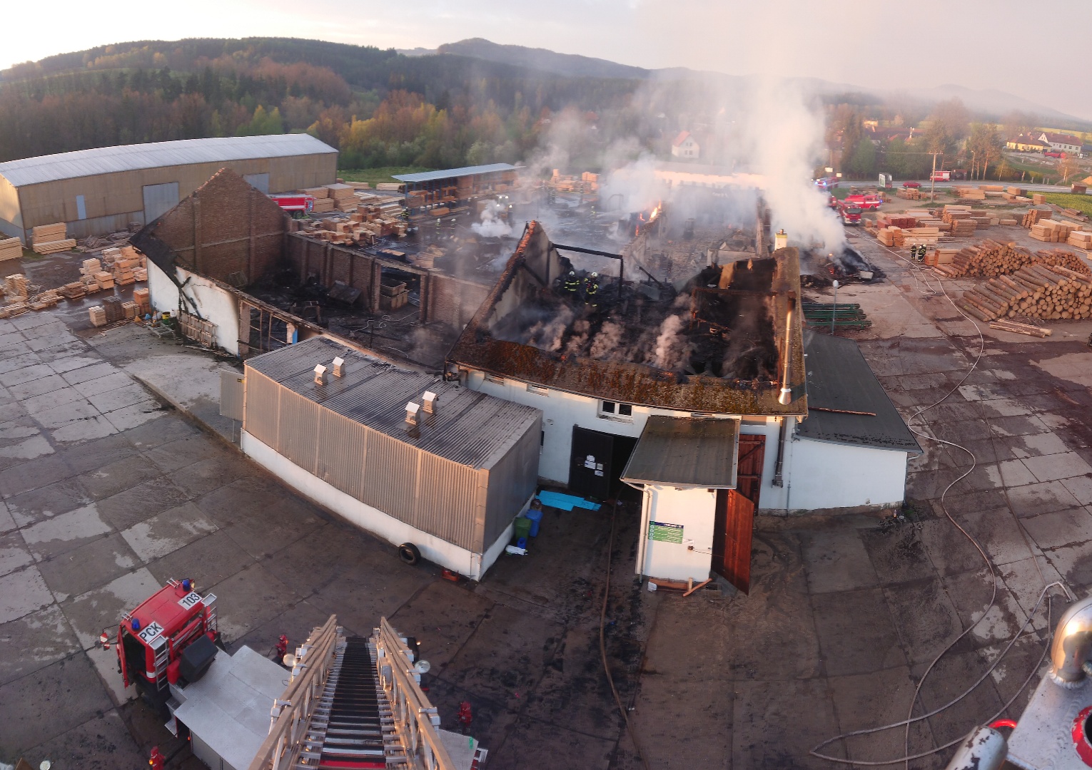 do tvaru písmene "L", ve kterém byla výrobna a také administrativní budova. Hořela i v těsné blízkosti uskladněná štěpka, piliny a desky na paletách. Rozvoj požárů byl natolik rychlý a intenzivní, že v zasaženém objektu hořelo prakticky všechno, od budovy jako takové, až po stroje, zařízení a vnitřní vybavení. V hořícím objektu nikdo nebyl, nepotvrdila se ani přítomnost tlakových láhví.
