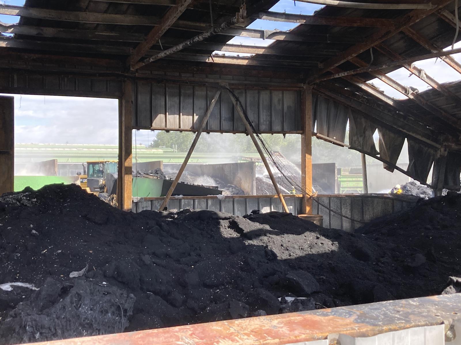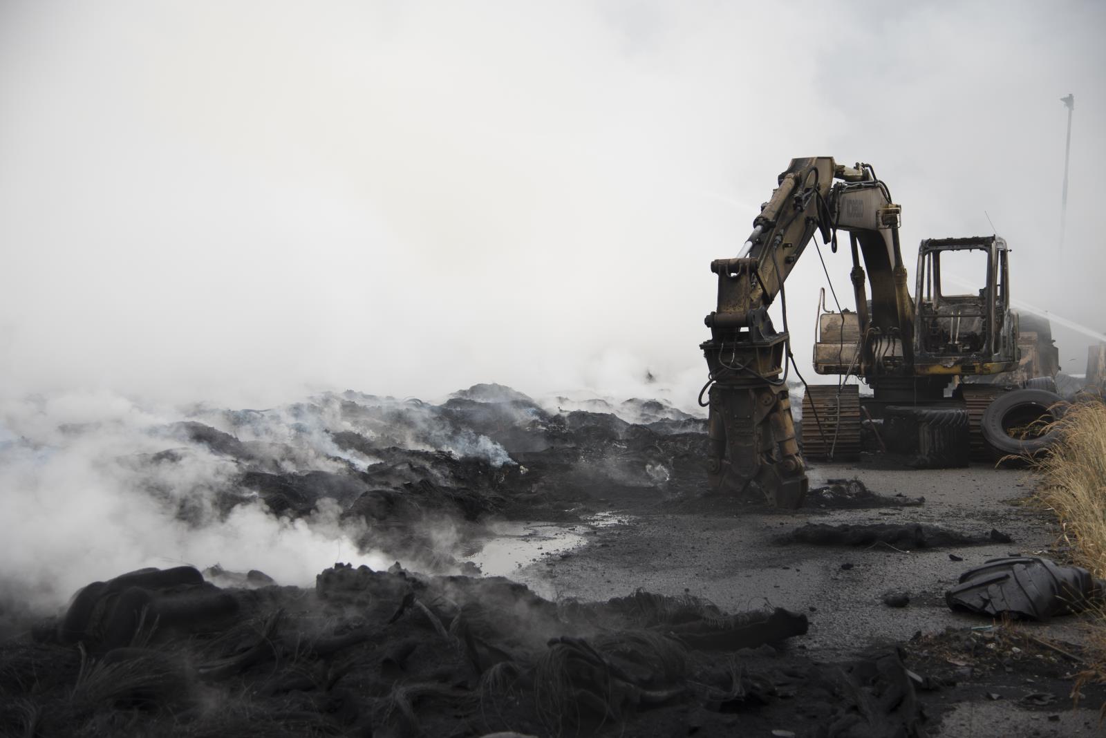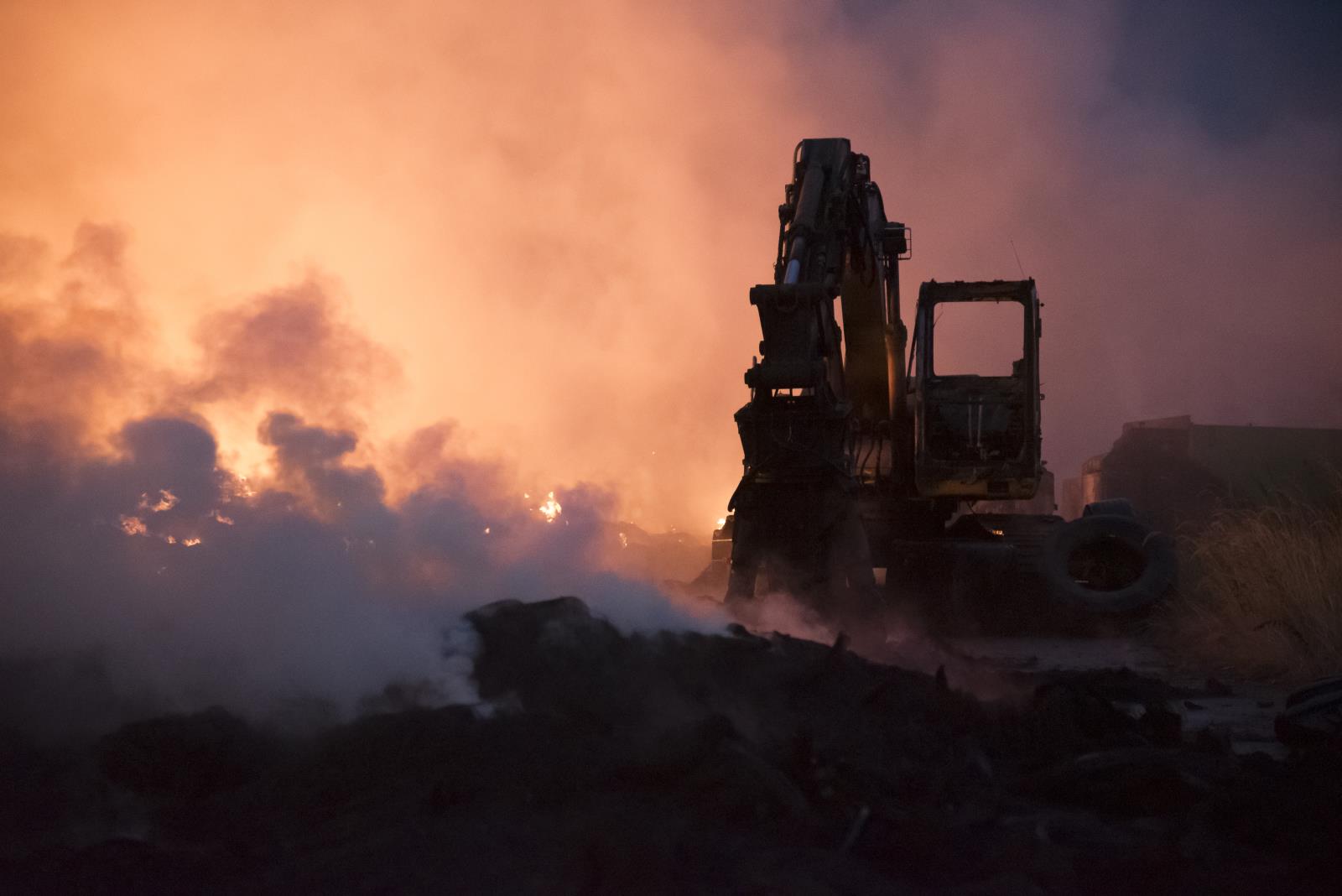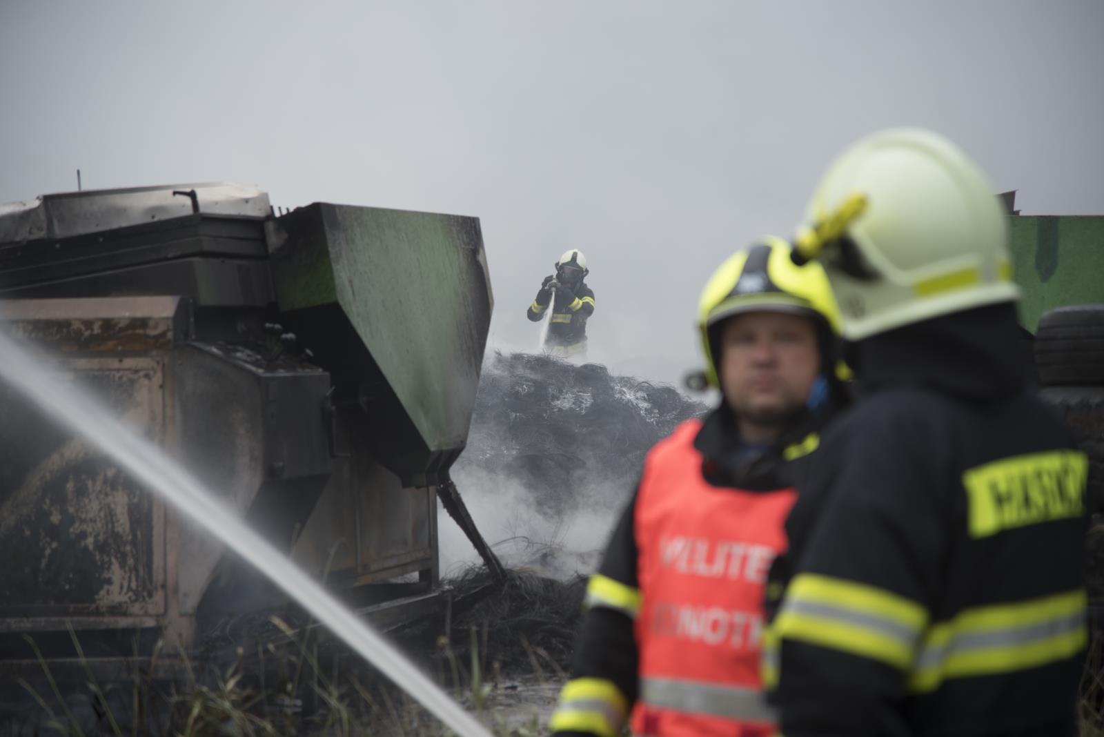Po 17. hodině začalo pásové rypadlo ze Záchranného útvaru HZS ČR rozebírat skladovací halu, ve které bylo třeba dohasit granulát.