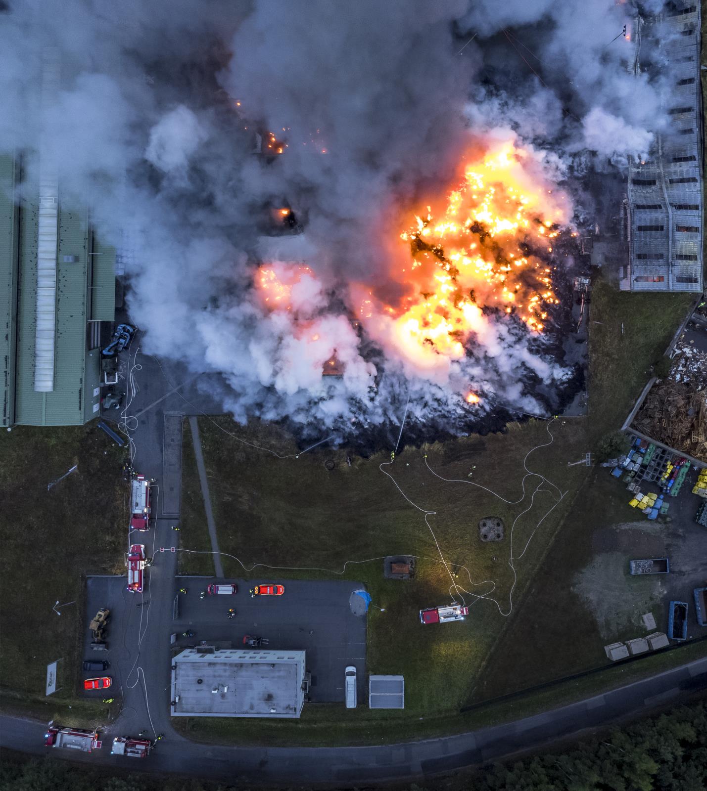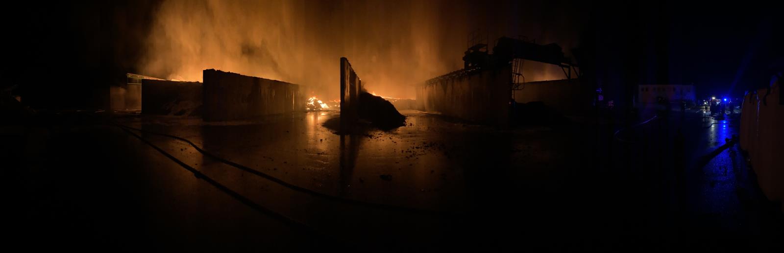 Ve 22:00 byl snížen stupeň požárního poplachu na 2., přes noc hasiči monitorovali požářiště a hasili ohniska, která se objevovala ve zborcené hale granulátu a v kójích.