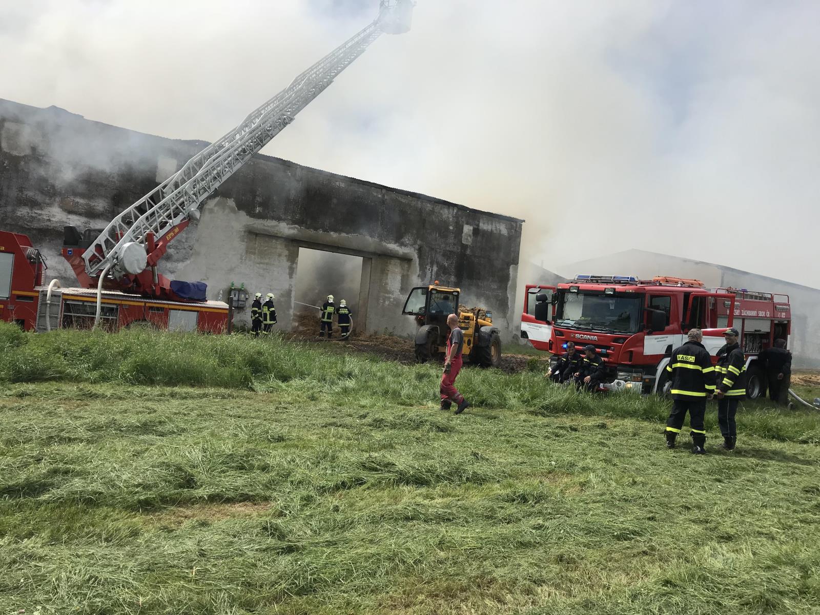 Požár zasáhnul sklad o půdorysu 30 x 15 metrů, který byl plný balíků slámy. Hasiči zahájili vyvážení balíků ven na volné prostranství, kde je prolévali vodou. Zároveň z automobilového žebříku ochlazovali střechu skladu. V 12:18 hodin velitel zásahu nahlásil lokalizaci požáru (požár se dále nešířil a jednotky byly na místě v dostatečném množství).