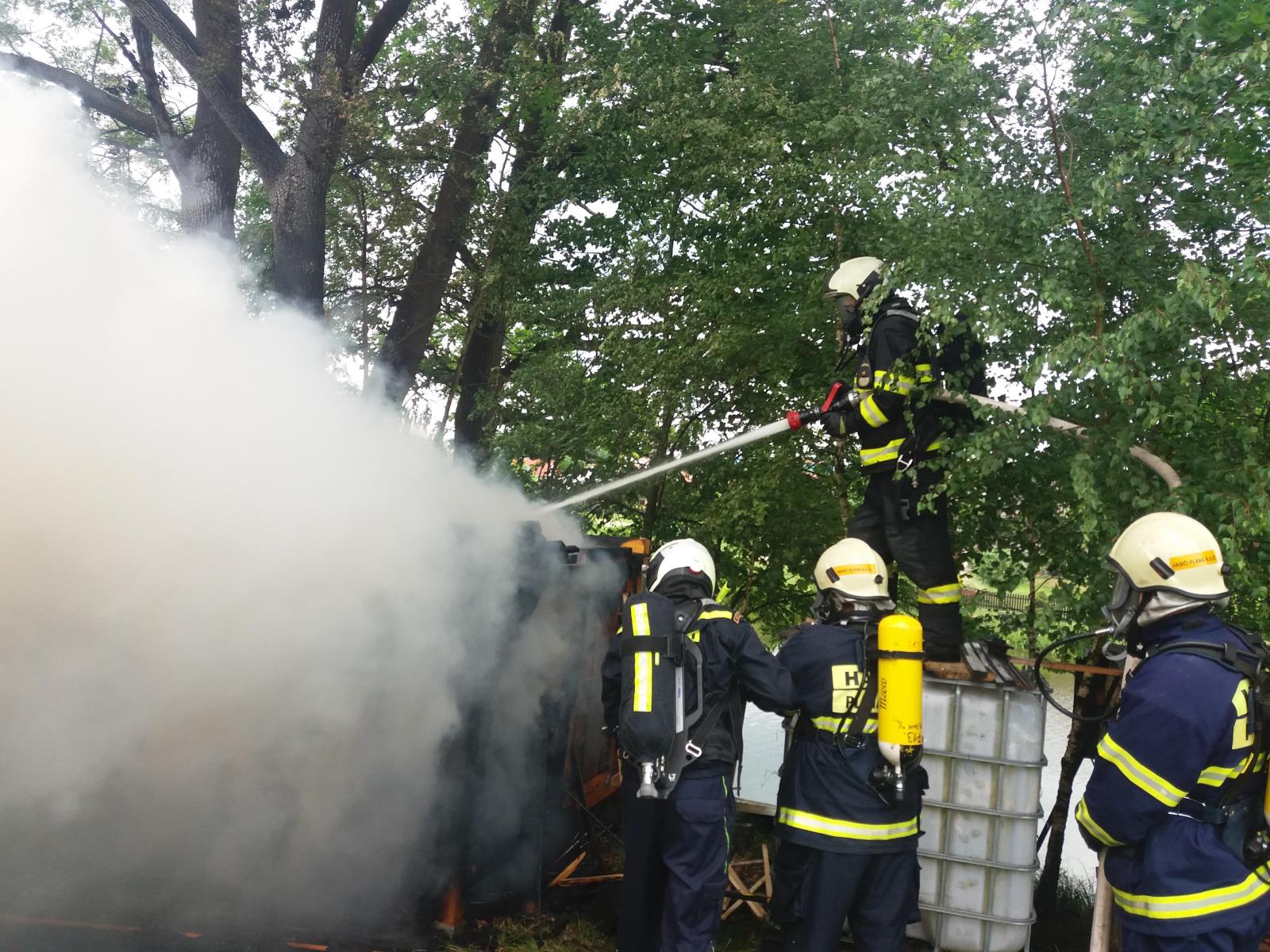 Průzkum na místě potvrdil požár stromu a upřesnil požár dřevníku s uskladněným dřevem. Na lokalizaci požáru a na zabránění dalšímu šíření hasiči nasadili dva útočné proudy. Další dvě cisterny dovážely kyvadlově na požářiště vodu.