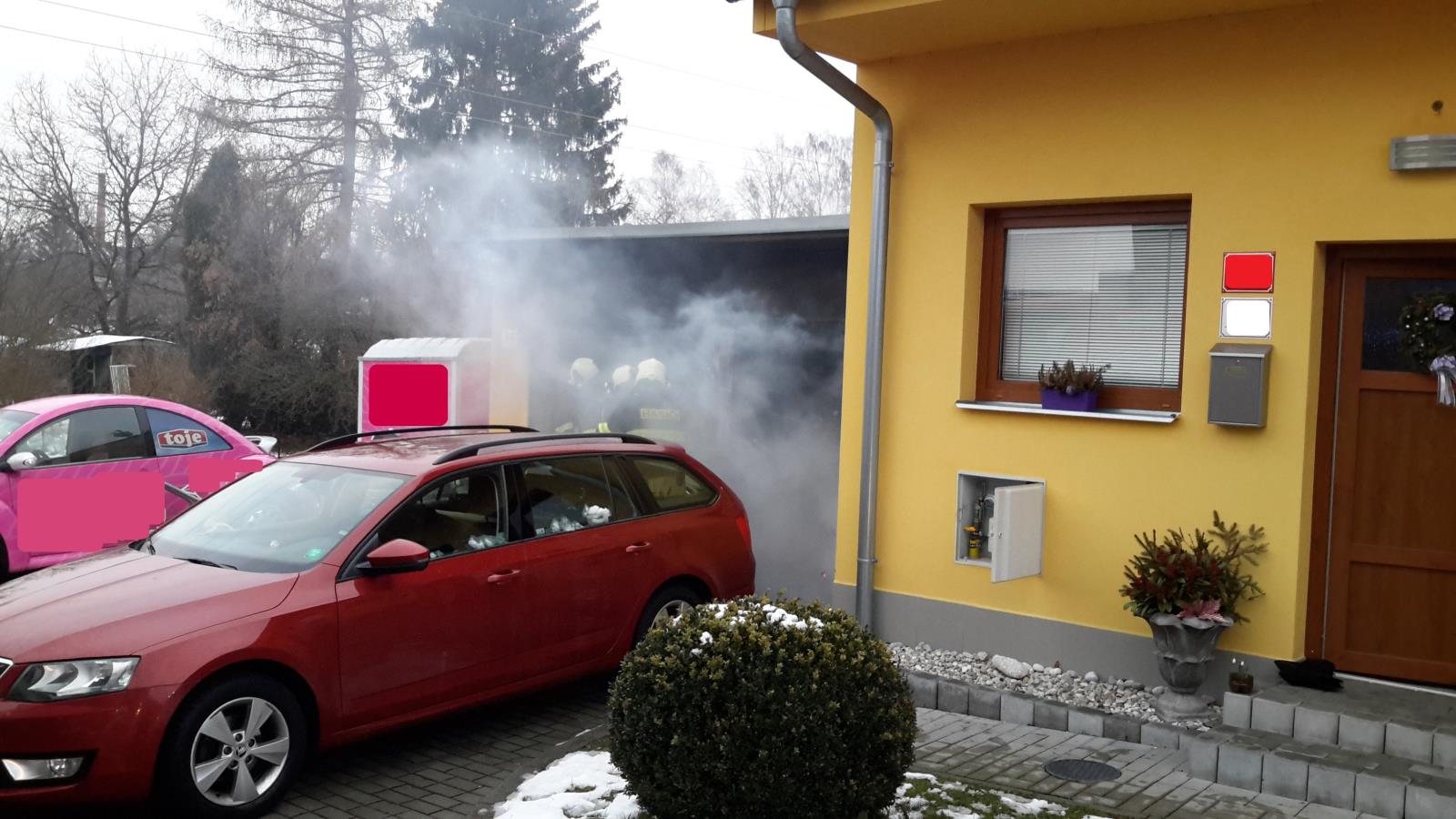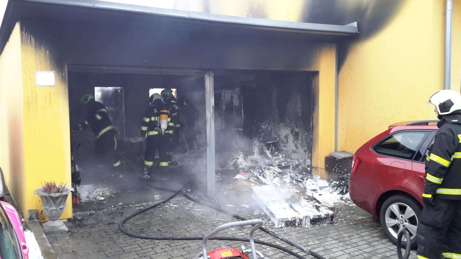 Průzkumem hasiči na místě zjistili, že se jedná o požár dvojgaráže, která sice těsně navazuje na rodinný dům, ale není stavebně propojena. Požár se tedy do domu nerozšířil. Uvnitř garáže nikdo nebyl, nemáme hlášeno, že by byl někdo zraněn. Hasiči z vnitřku garáže vynesli dvě propanbutanové láhve a kanystr z benzínem. Ani ty díky rychlému zásahu hasičů požár nestačil poškodit.