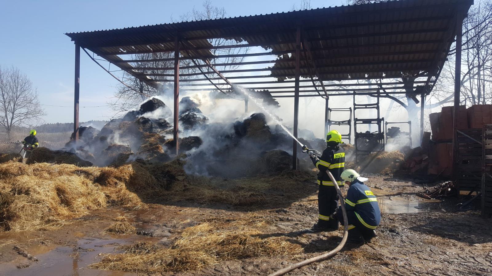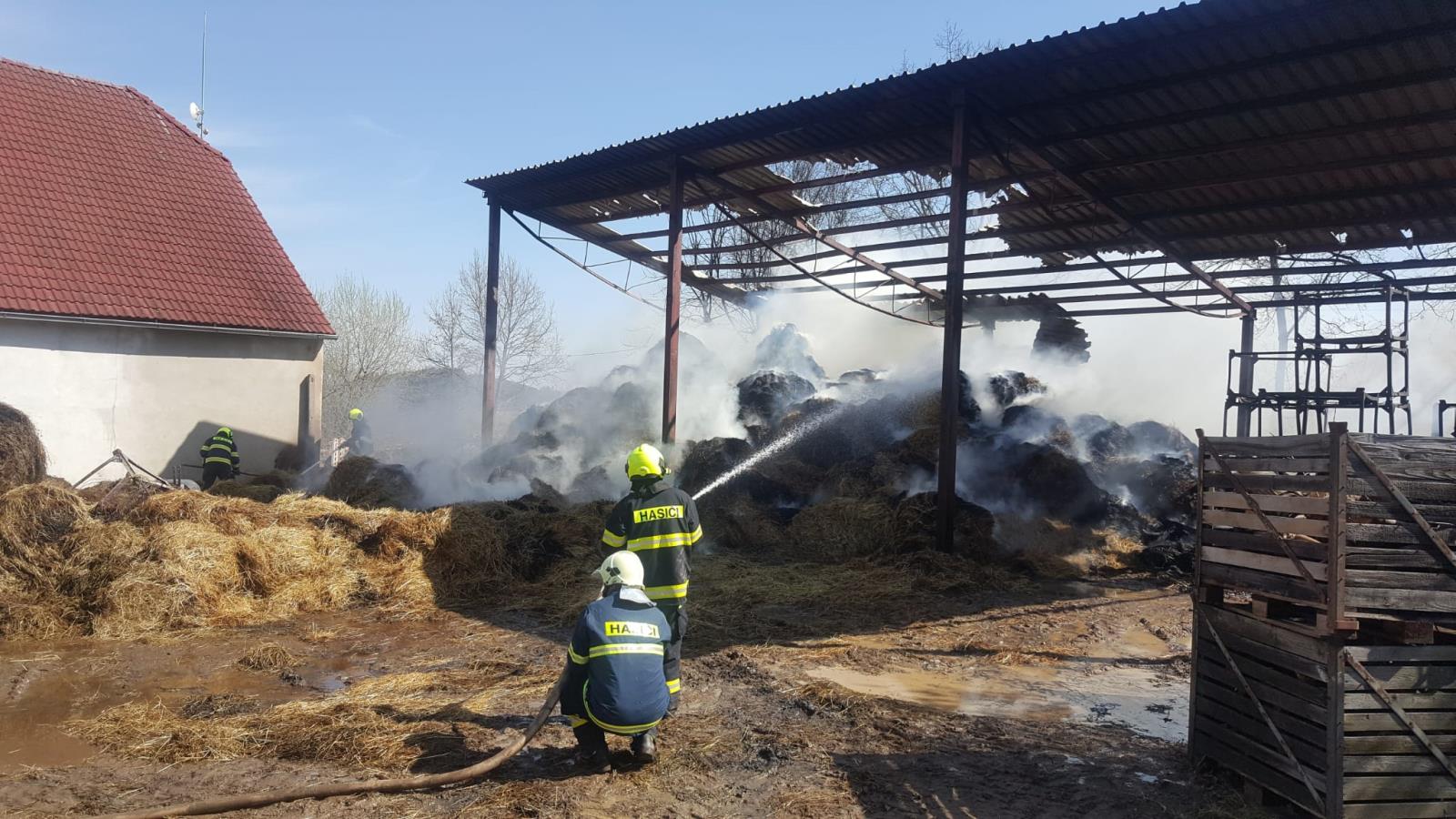 Požár zasáhnul otevřený přístřešek o půdorysu 30 x 10 metrů, kde bylo uskladněno seno a dříví. Zasahujícím hasičům se podařilo oddělit hořící přístřešek od vedle stojící budovy. V 14:10 hodin byla nahlášena lokalizace požáru  - tedy, že požár je pod kontrolou zasahujících hasičů, dále se nešíří a na požářišti je dostatek zasahujících hasičů a techniky. Následovalo velice zdlouhavé vyskladňování všech balíků a jejich dohašování na volném prostranství. Okolo 21. hodiny část jednotek zásah ukončila. Požářiště však bylo monitorováno po celou noc dvěma jednotkami. Úplná likvidace požáru nastala až v pátek 15. dubna v 11:17 hodin.