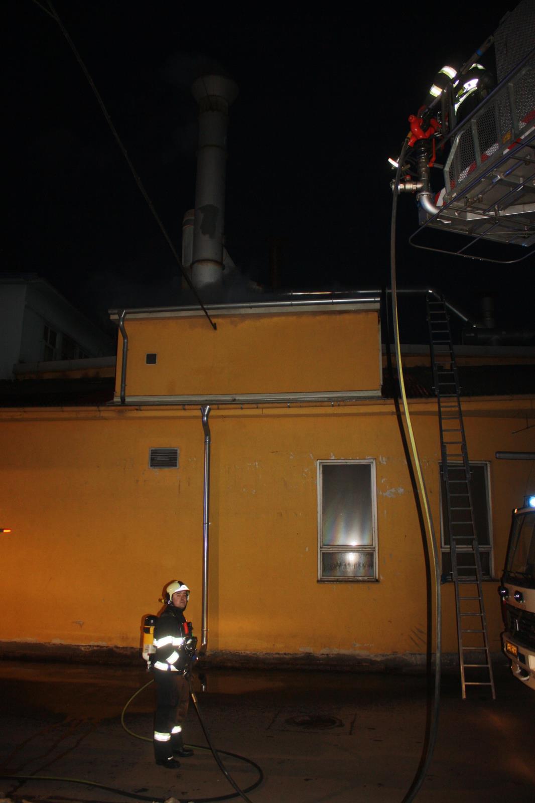 Jednotka zahájila likvidaci požáru uvnitř haly jedním vysokotlakým proudem. Požár se z filtrační jednotky rozšířil do střechy haly. Velitel zásahu si proto jako posilovou jednotku vyžádal automobilovou plošinu.