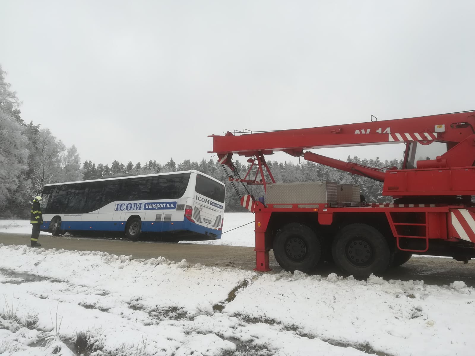 Profesionální jednotka ze stanice Třeboň vyjela krátce před 9. hodinou společně s jednotkou SDH obce Suchdol nad Lužnicí k Chlumu u Třeboně, části obce Mirochov, kde havaroval autobus. Hasiči na místě zjistili, že v autobuse cestovaly tři osoby a nikdo z nich nebyl nijak zraněn. Autobus byl částečně na silnici, částečně v příkopu. Vyproštění pomocí cisterny nestačilo, velitel zásahu si povolal posilovou jednotku – vyprošťovací automobil z jindřichohradecké stanice. V 9:50 hodin bylo na operační středisko velitel zásahu nahlášeno, že autobus je bez jakéhokoli poškození vyproštěn zpět na silnici. U nehody hasiči spolupracovali s Policií ČR.