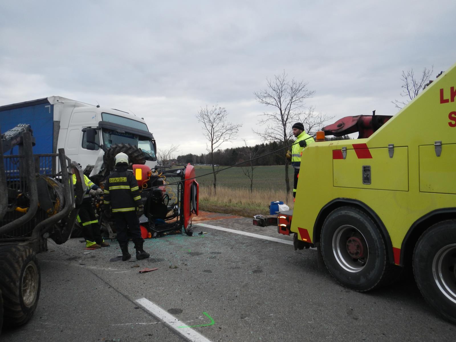 Střet kamiónu s traktorem s vyvážecím vlekem zablokoval celou silnici. Hasiči zajistili místo nehody a provedli požární zabezpečení. Následovalo opatření proti úniku provozních kapalin. U nehody zasahovali také zdravotníci ZZS, kteří ošetřili a k dalšímu ošetření odvezli řidiče traktoru, a policisté, kteří stanovili objízdnou trasu. Řidič nákladního vozidla vyváznul bez zranění.