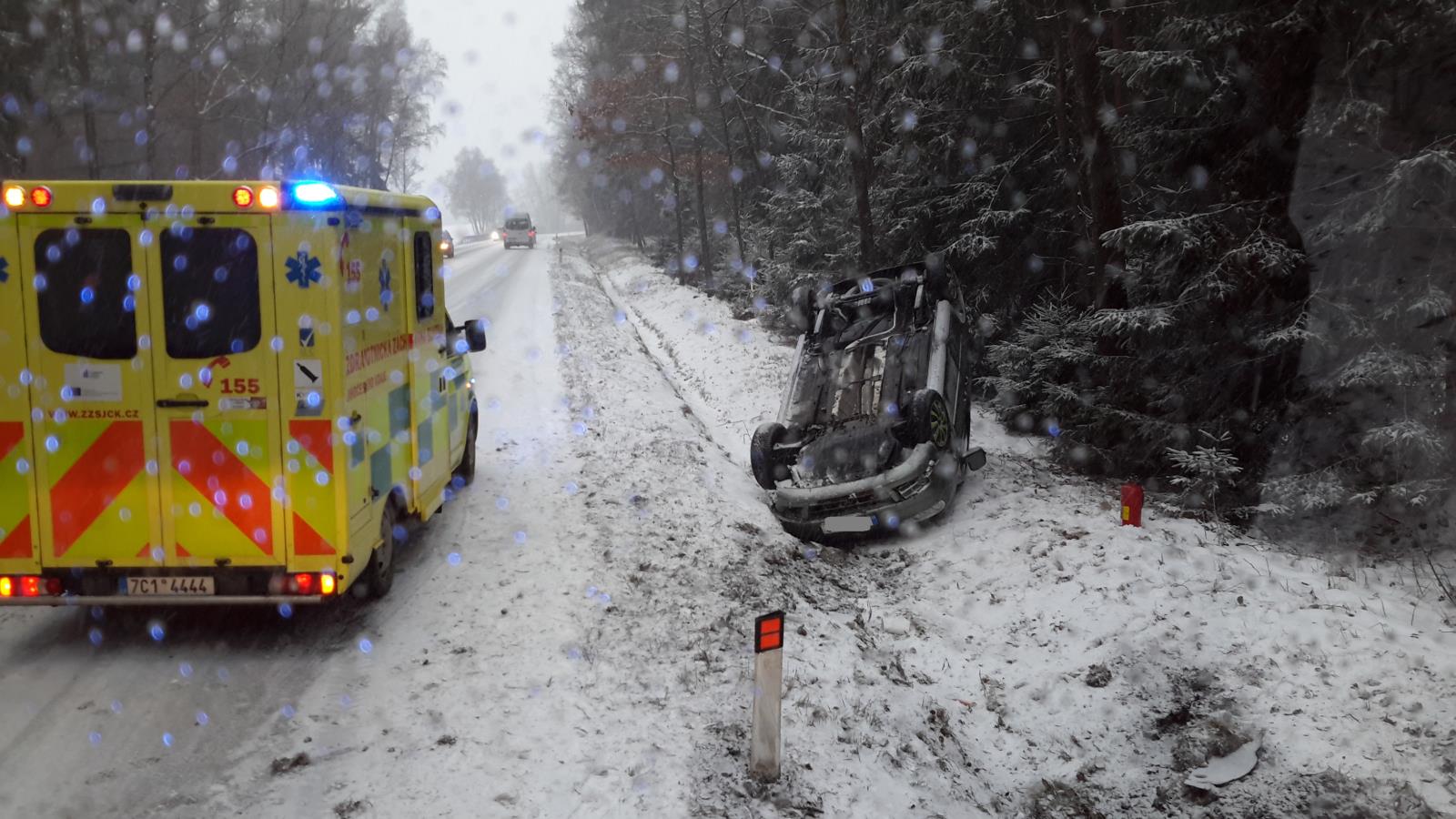 Dopravní nehoda – Komplikaci v provozu na silnici způsobil sníh také na silnici I/3 u Bujanova – Nažidel. Havaroval zde osobní automobil, který skončil na střeše v příkopu.