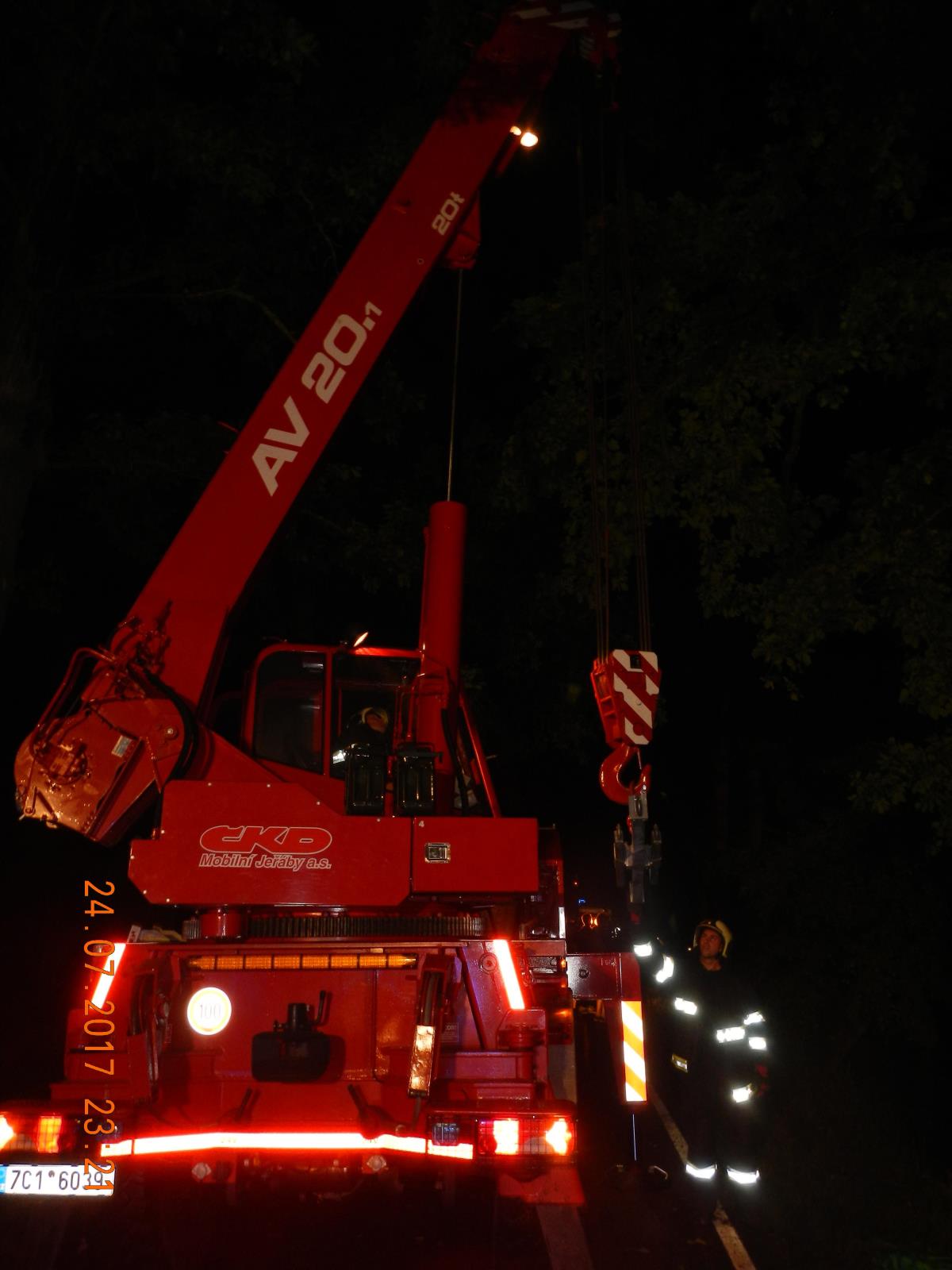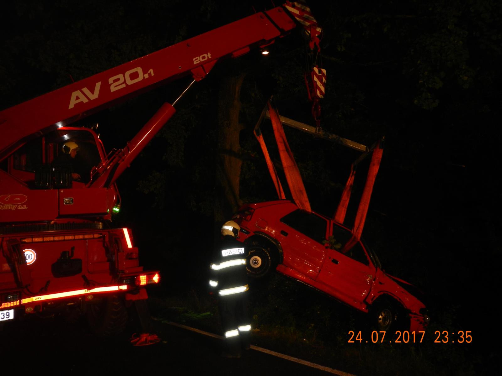 Hasiči u nehody zasahovali s cisternou a vyprošťovacím automobilem. V autě cestovaly dvě osoby, byly z auta venku před příjezdem hasičů. Hasičům se podařilo auto vyprostit bez úniku provozních kapalin.