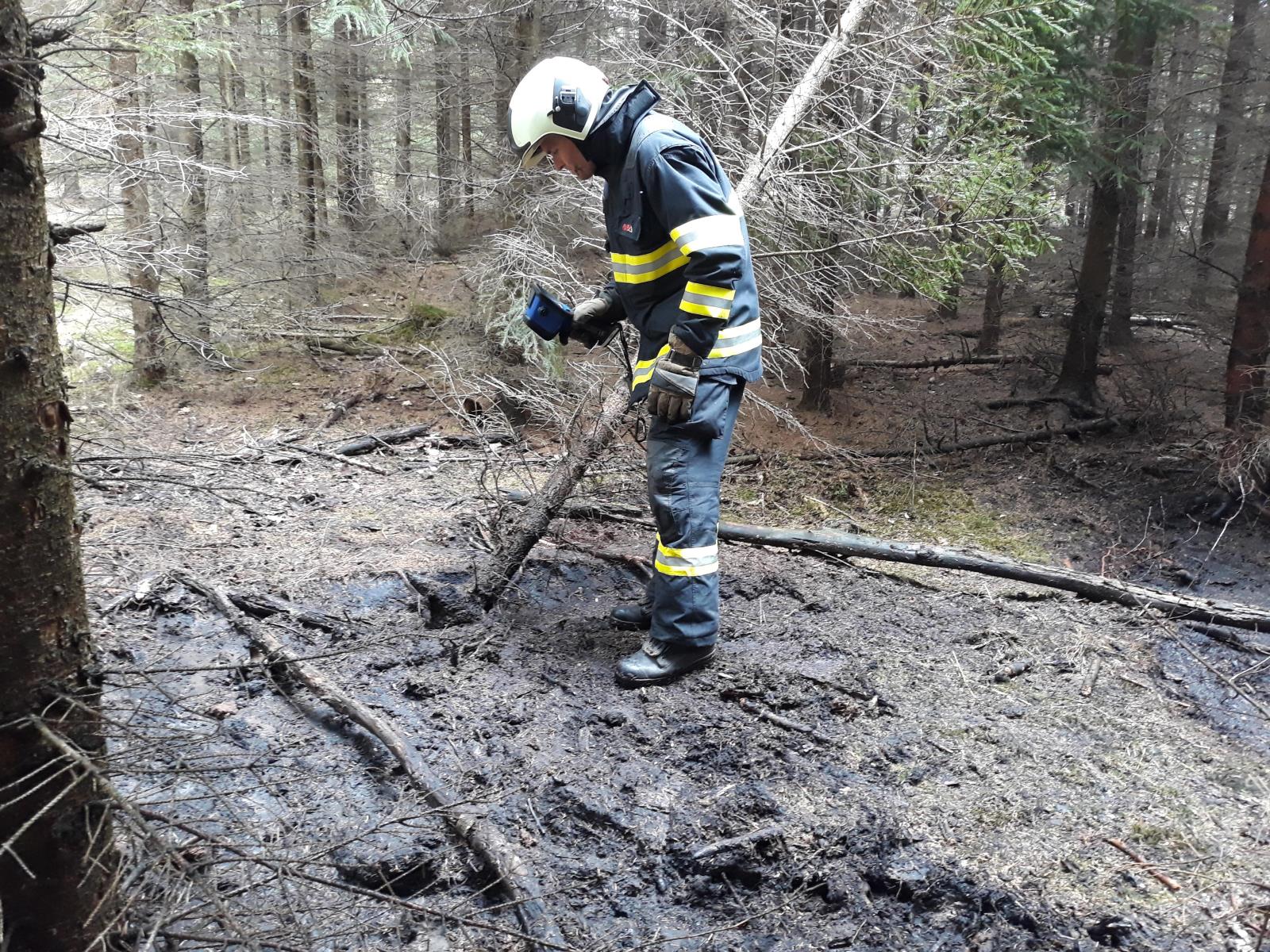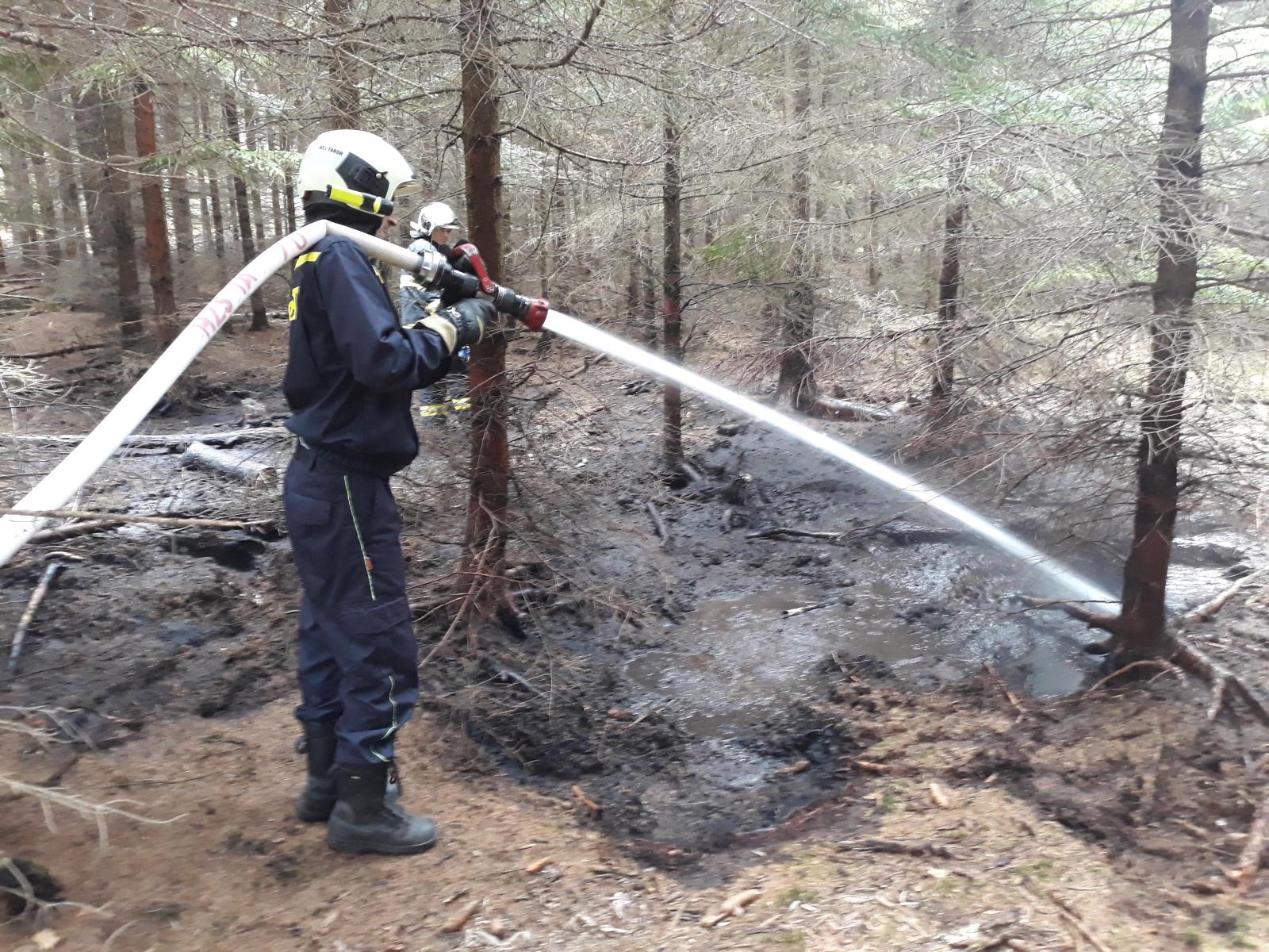Hasiči vytvořili útočné vedení z cisterny, kterou kvůli nezpevněnému povrchu museli nechat na lesní komunikaci hasicR4.jpgvzdálené asi 200 metrů od požářiště. Dobrovolné jednotky, které se postupně k požáru dostavily, velitel zásahu určil pro doplňování vody do táborské cisterny. Požár hasiči uhasili za hodinu, závěrečný průzkum byl proveden termokamerou.