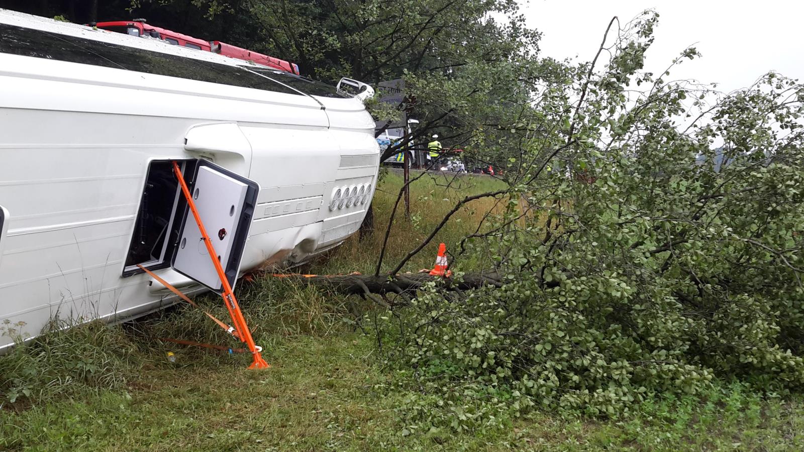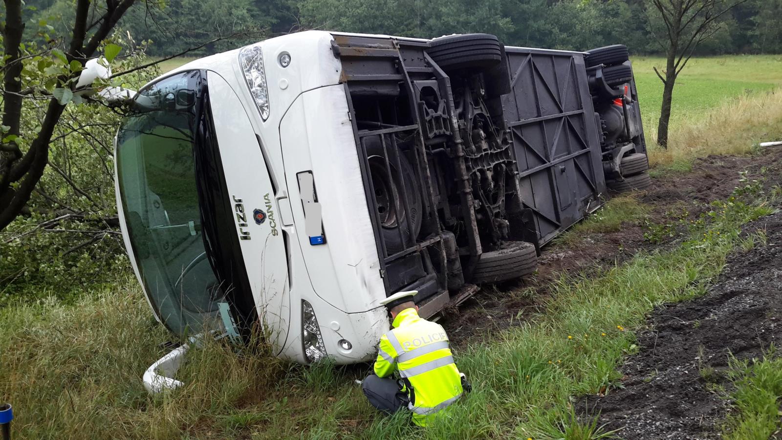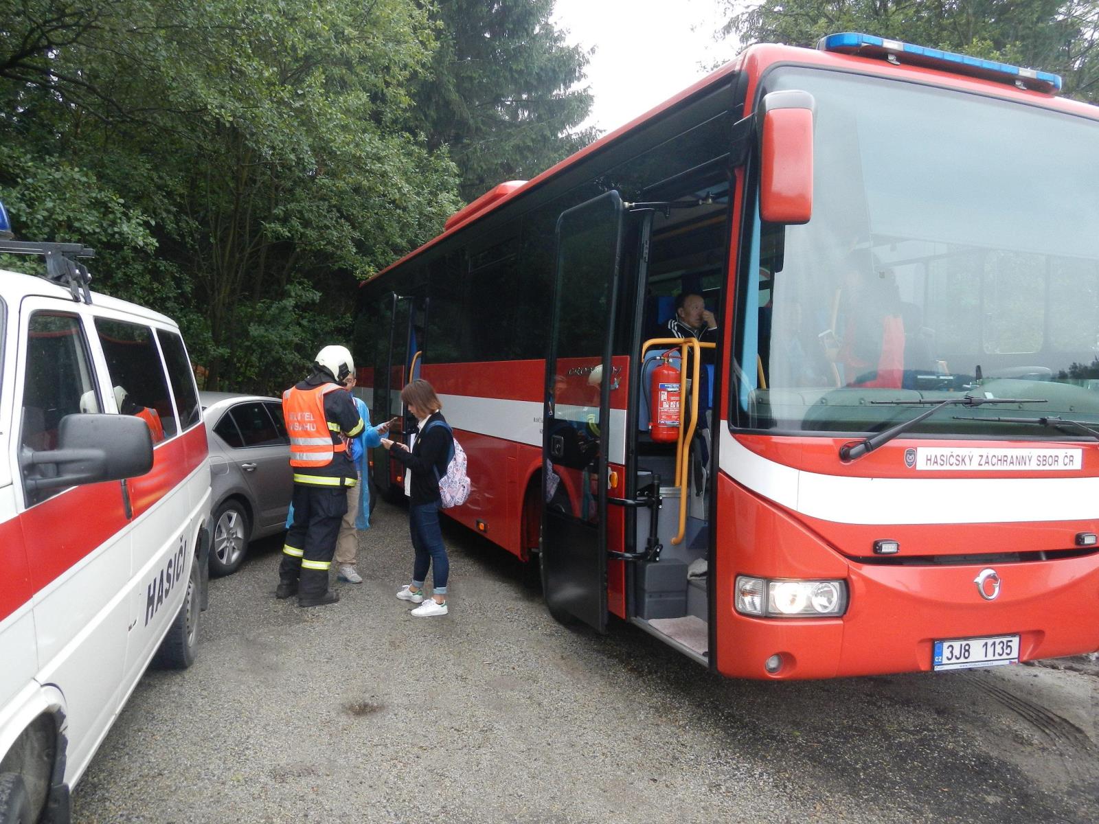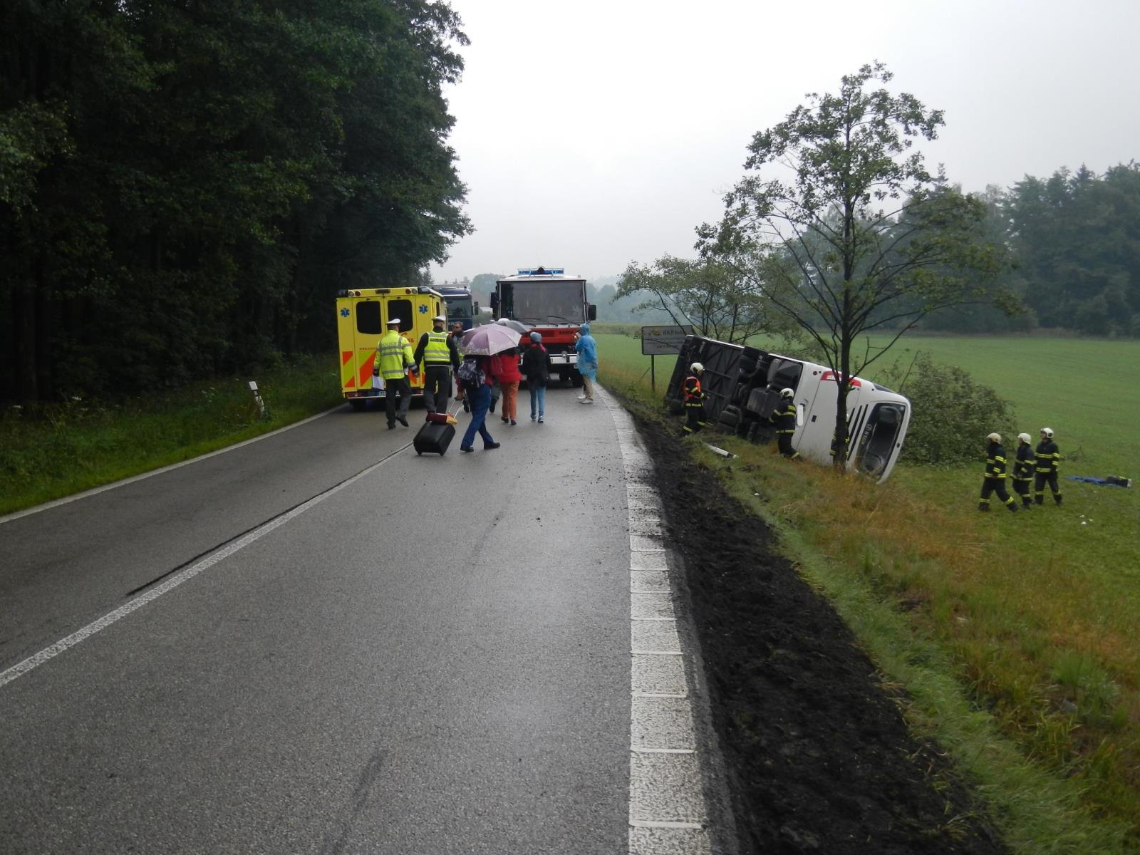 Havarovaný autobus, který sjel do příkopu, byl už v době příjezdu hasičských jednotek mimo vozovku. Hasiči jej zajistili proti požáru a zkontrolovali možný únik provozních kapalin.