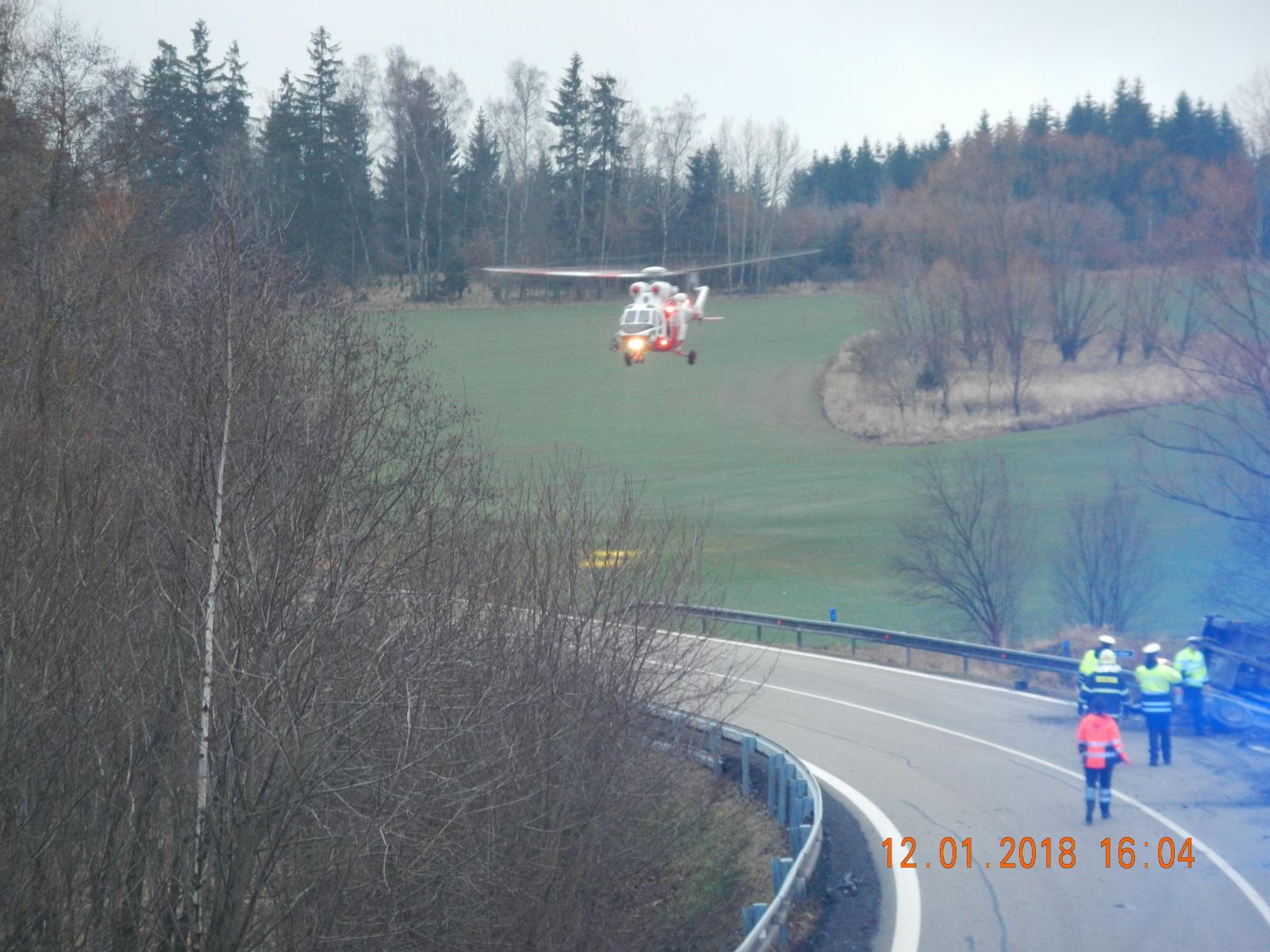 Po vyproštění řidiče hasiči pomohli zdravotníkům ZZS s jeho transportem do vrtulníku LZS.