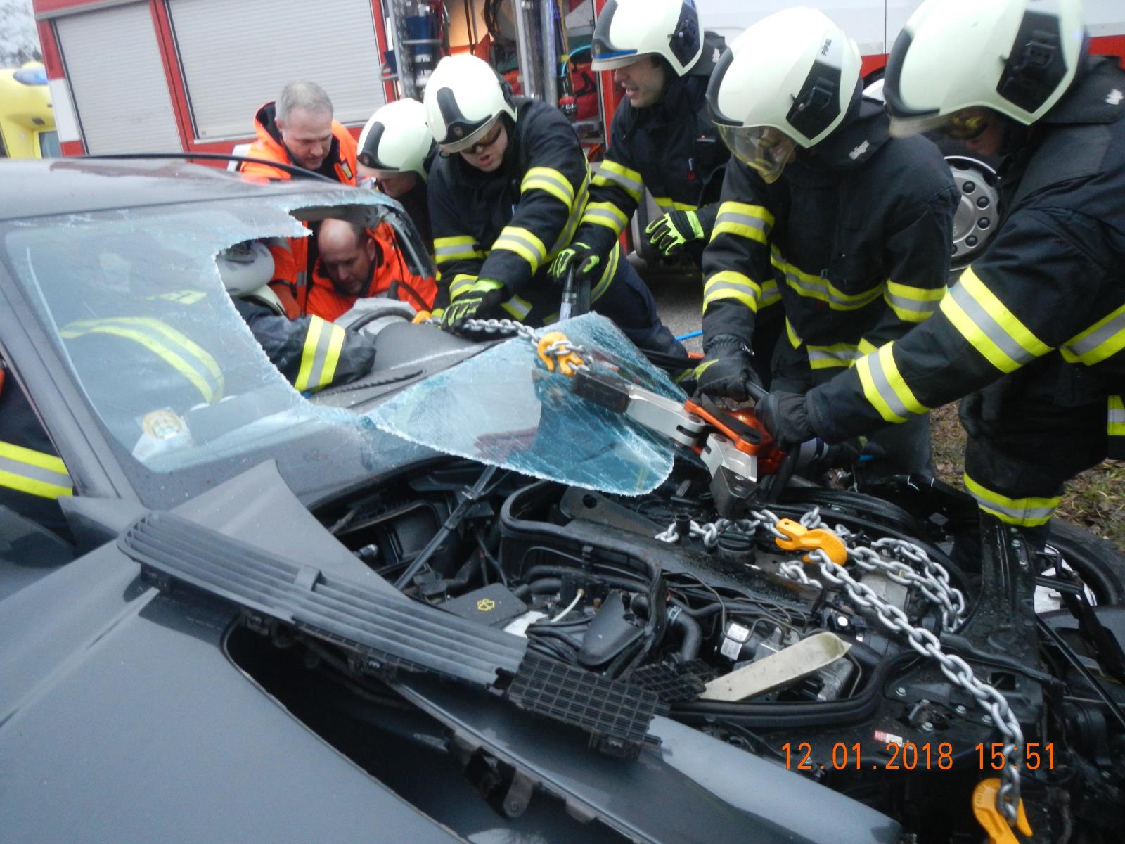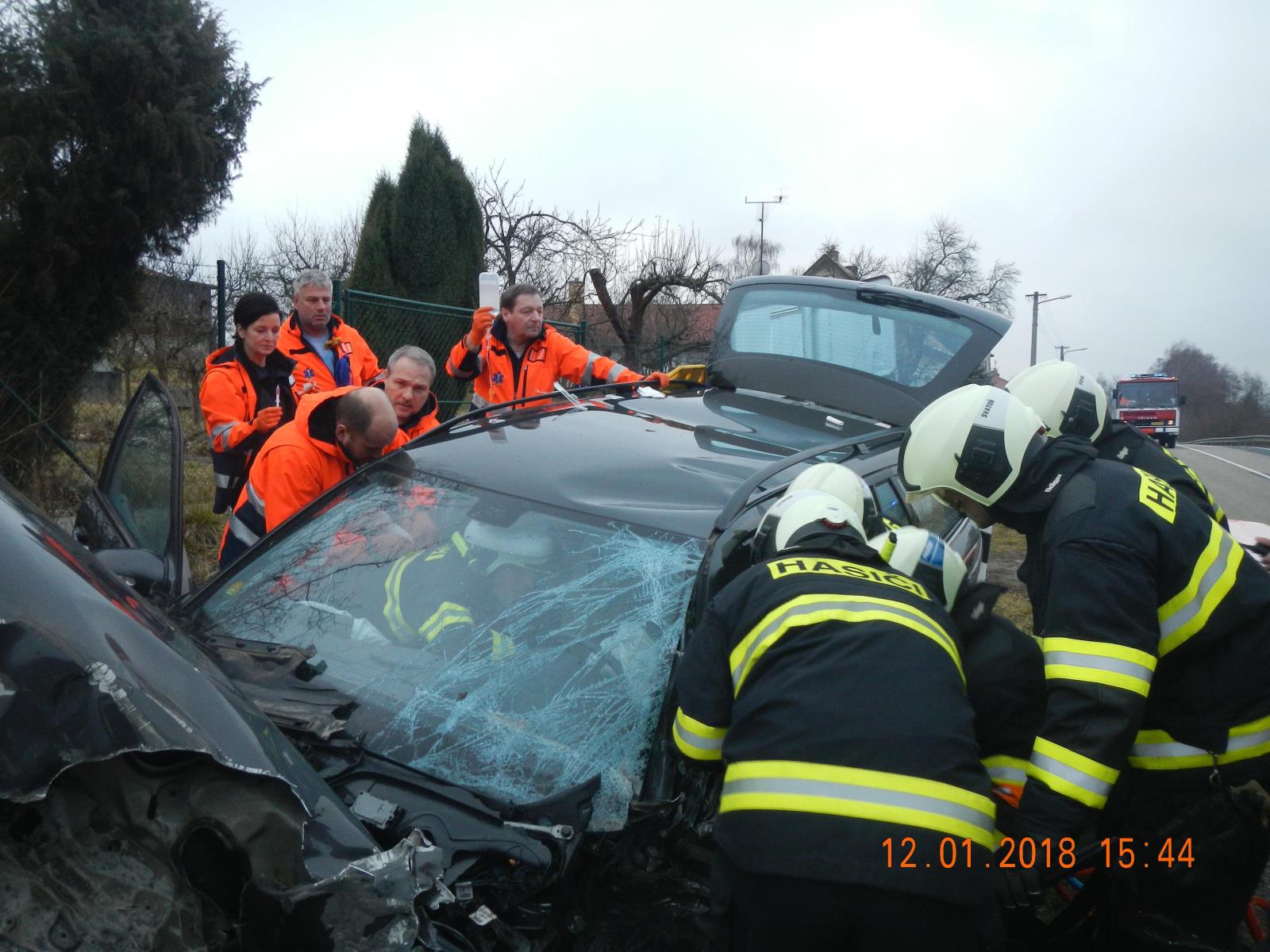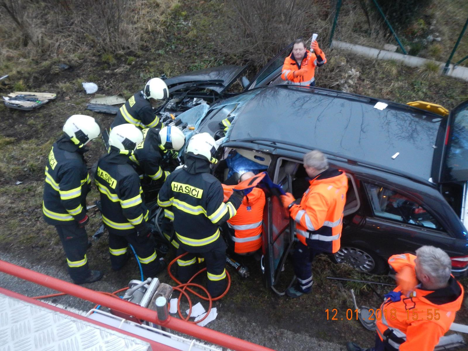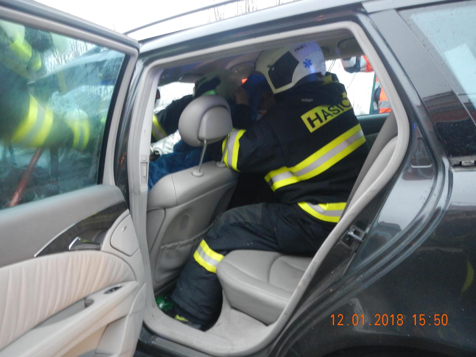 Řidič nákladního auta vyváznul bez zranění, v době příjezdu hasičů byl z kabiny vozu venku. V Mercedesu byl zaklíněný zraněný řidič, jeho spolujezdec byl nezraněn z auta venku. Hasiči ihned zahájili vyprošťování. Použili hydraulické nůžky, rozpínací zařízení a rozpěrný válec.