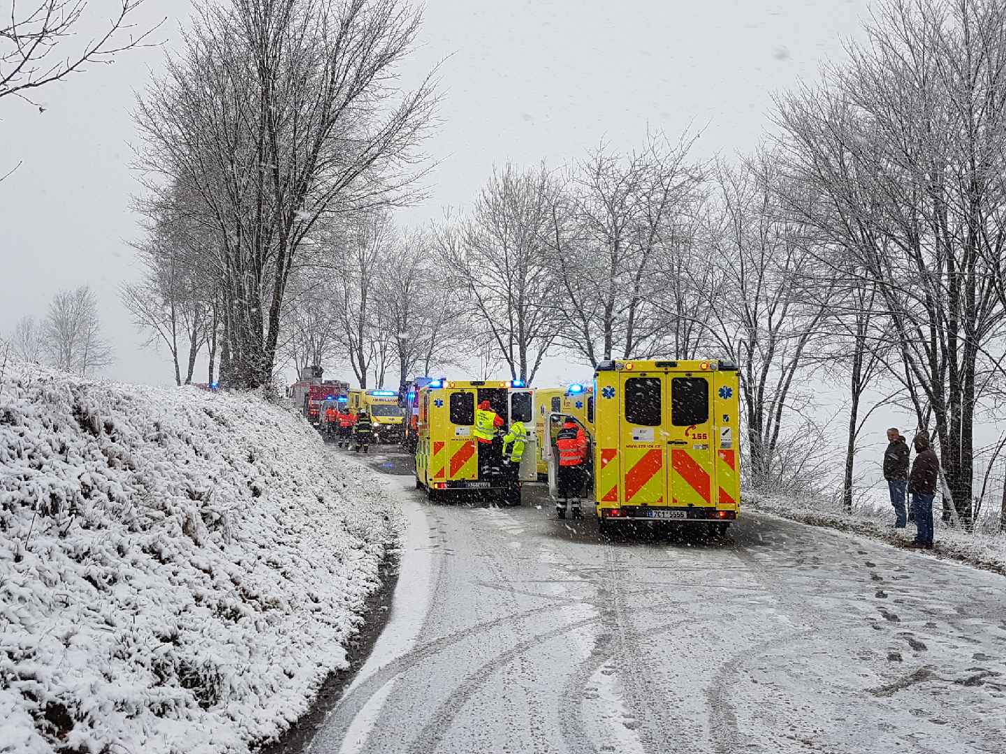 Po průzkumu na místě nehody podal velitel zásahu zprávu, že v havarovaném autobusu cestovalo kromě řidiče 13 osob. Jedna osoba nehodu nepřežila, zdravotníci ZZS vrtulníkem a sanitkami do nemocnic transportovali 11 zraněných.