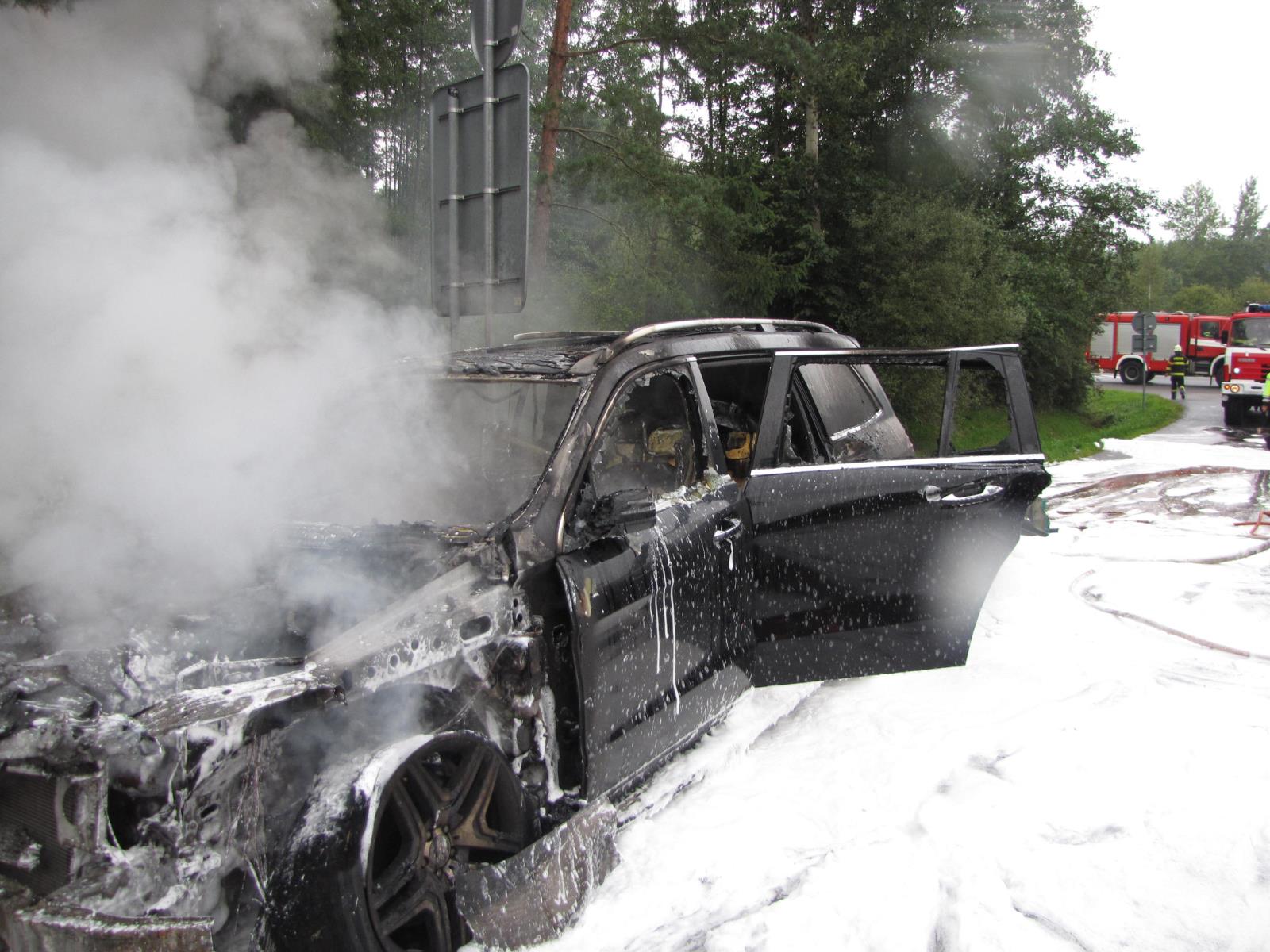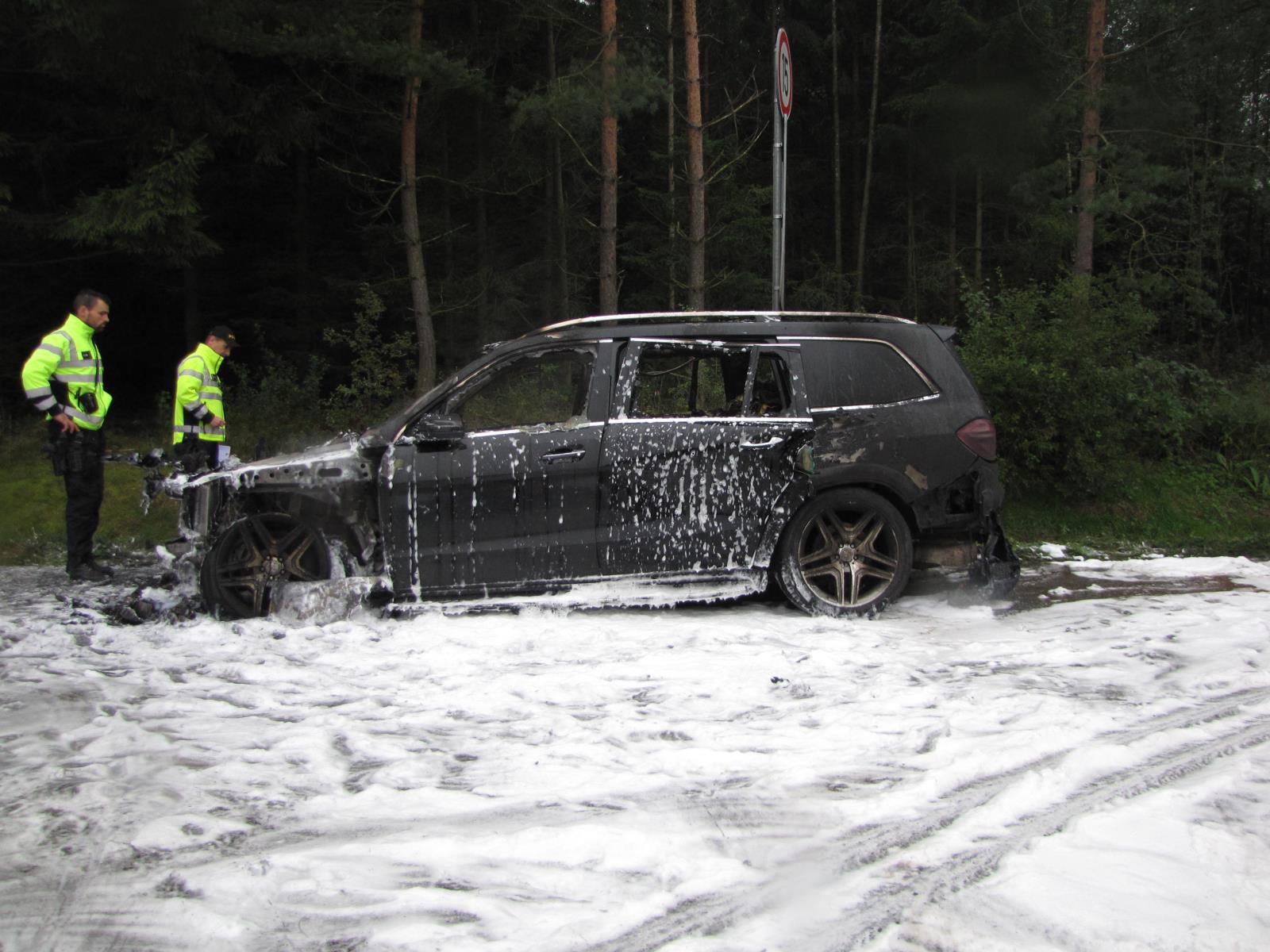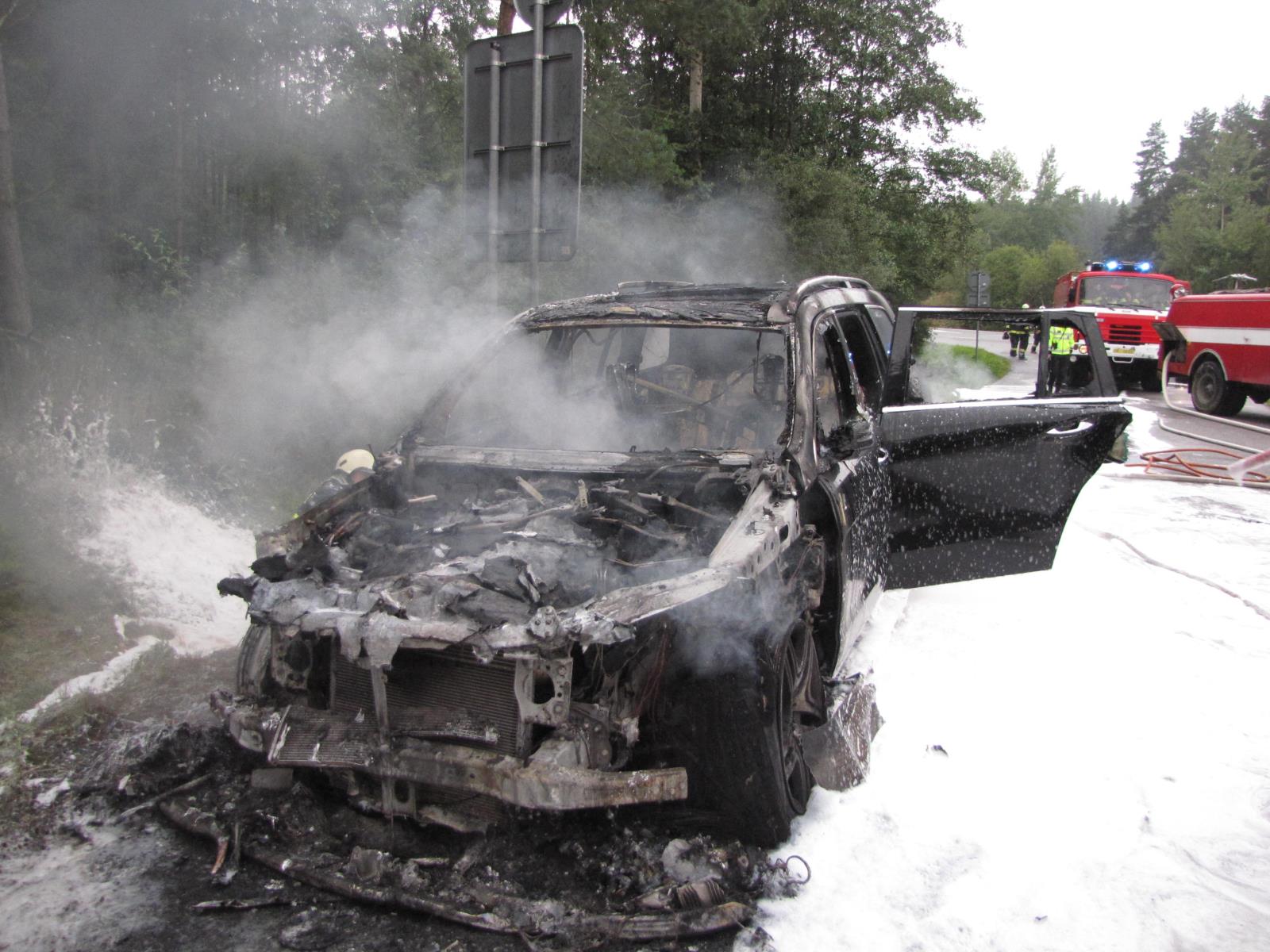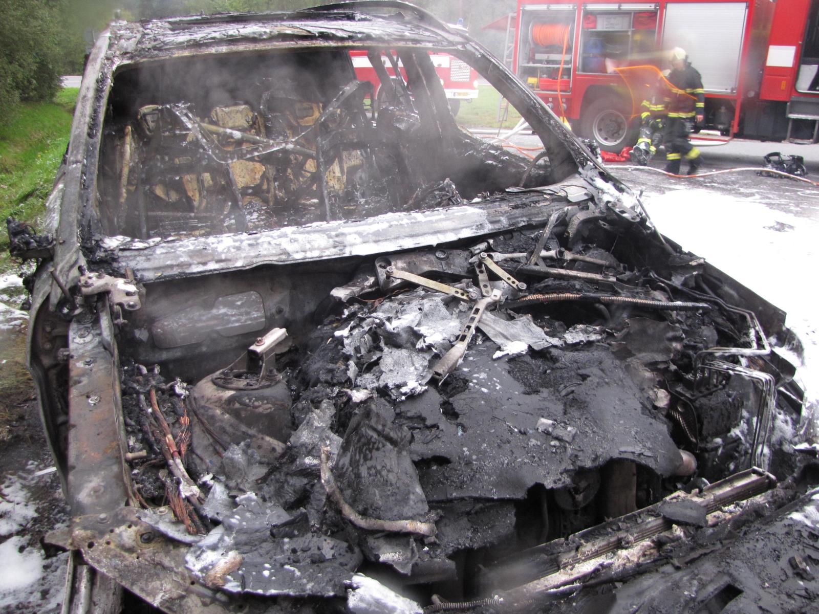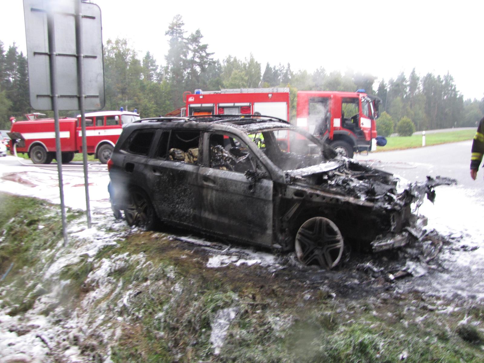 Jako první k požáru přijeli kapličtí profesionálové, kteří po průzkumu potvrdili, že se jedná o osobní automobil, a to tovární značky Mercedes Benz. V době příjezdu hasičů hořela více než polovina auta a požár rychle postupoval od přední motorové části dozadu. Hasiči na likvidaci nasadili vysokotlaký proud, ale téměř současně se zahájením hašení vzplál benzín vytékající z nádrže. Hořící benzín tekl pod auto a zároveň s hořící hasební vodou z mírného svahu od auta. Pro rychlé a efektivní uhašení auta i benzínu velitel zásahu okamžitě rozhodnul o nasazení těžké pěny. Zároveň hasiči zavodnili hadici C a vytvořili z ní hráz pro odvod odtékající hasební pěny mimo vozovku. V průběhu hašení se dále vznítily hliníkové části karoserie a přední kolo vyrobené z lehkých slitin. Proto hasiči nasadili ještě další proud s turboproudnicí. Po půl hodině dostali hasiči požár pod kontrolu, úplnou likvidaci požáru velitel zásahu nahlásil v 8:46 hodin.