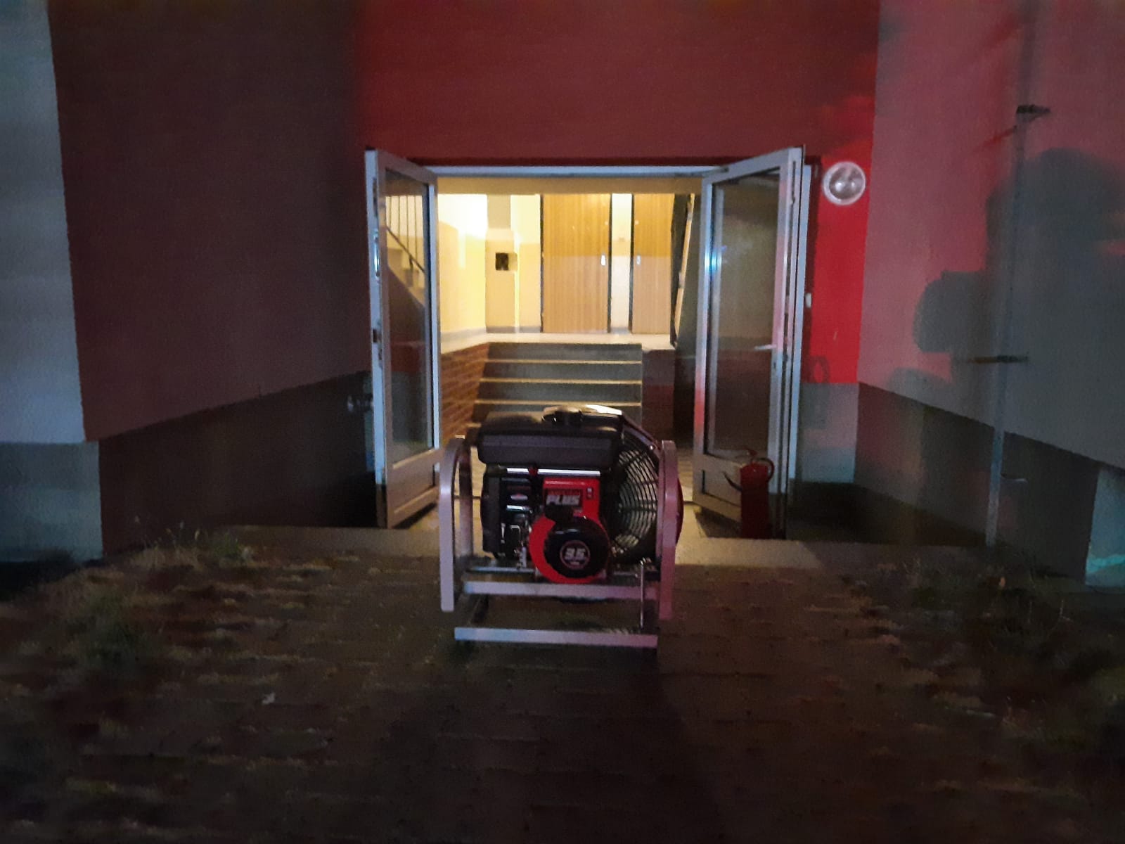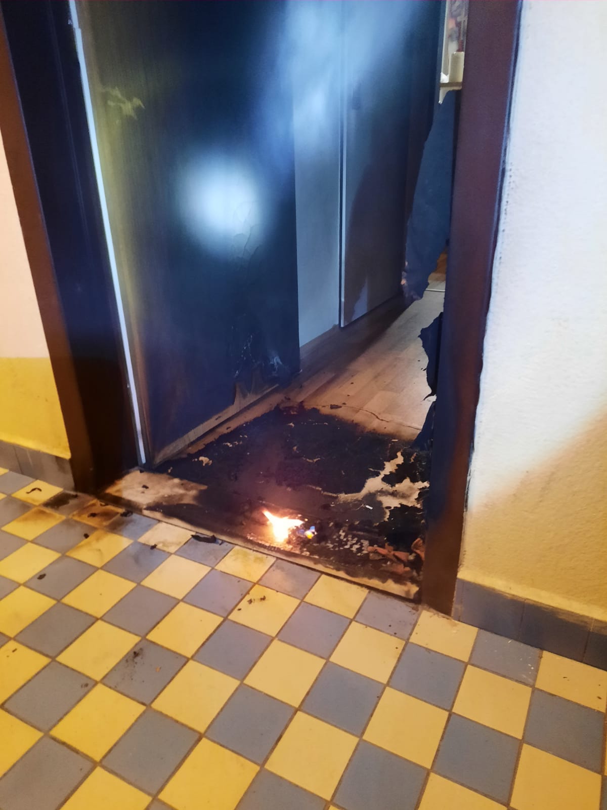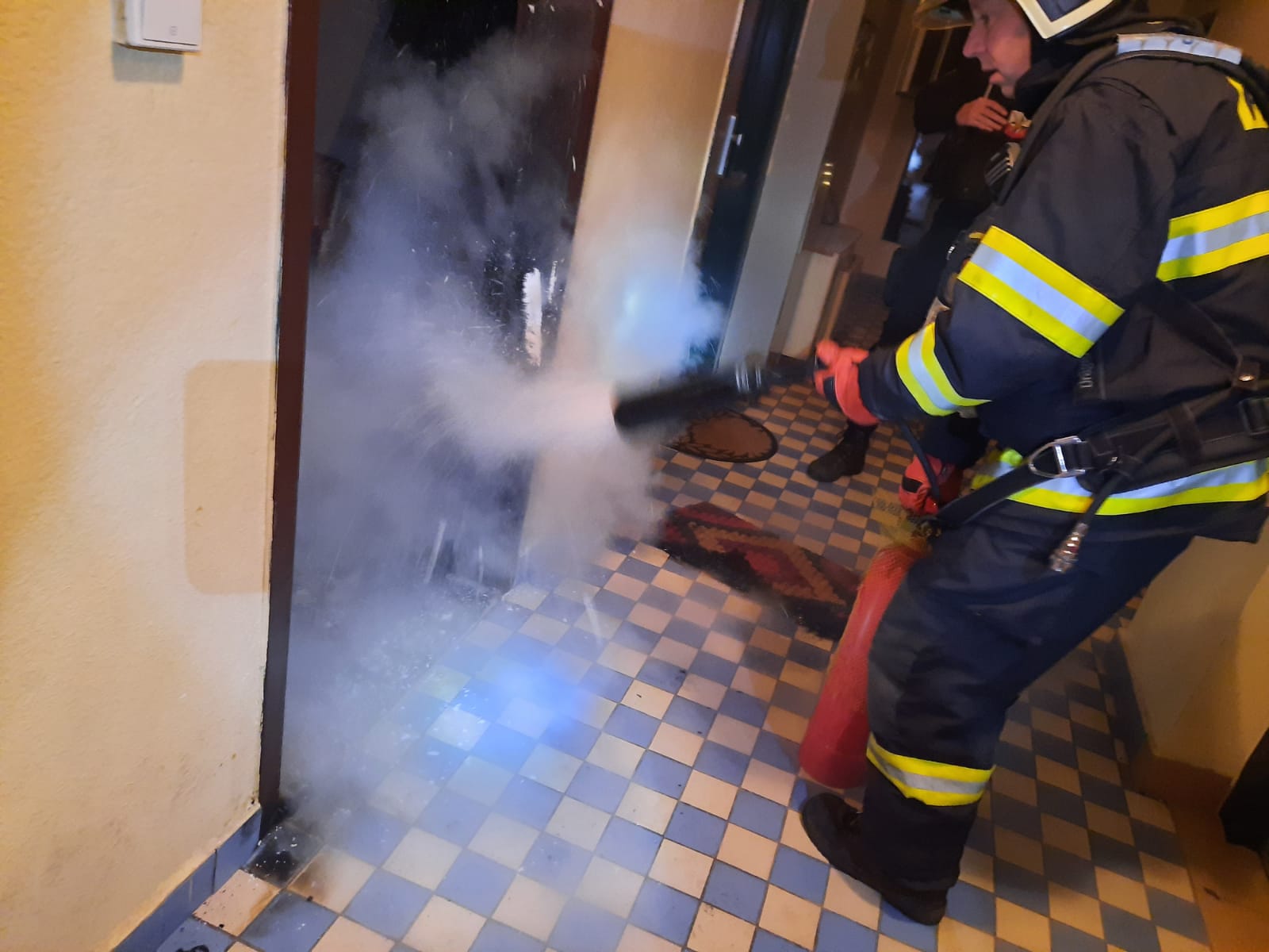 K požáru přijeli těsně před půlnocí profesionální hasiči z táborské stanice a průzkumem zjistili, že se jedná o požár menšího rozsahu. Hořela rohožka, práh dveří, vstupní dveře a část lina uvnitř bytu na ploše přibližně 1 m2. Hasiči na lokalizaci a následnou likvidaci požáru použili přenosný hasicí přístroj. Na odvětrání domu pak byla nasazena přetlaková ventilace.