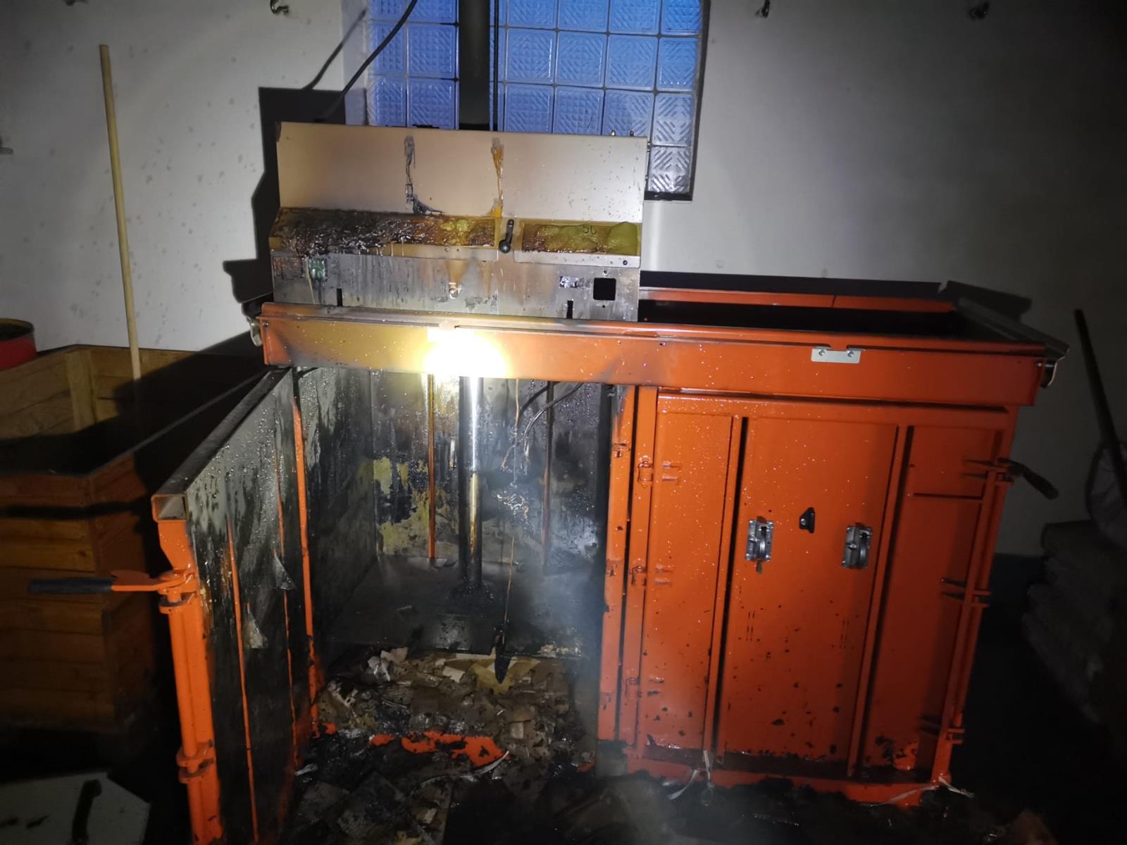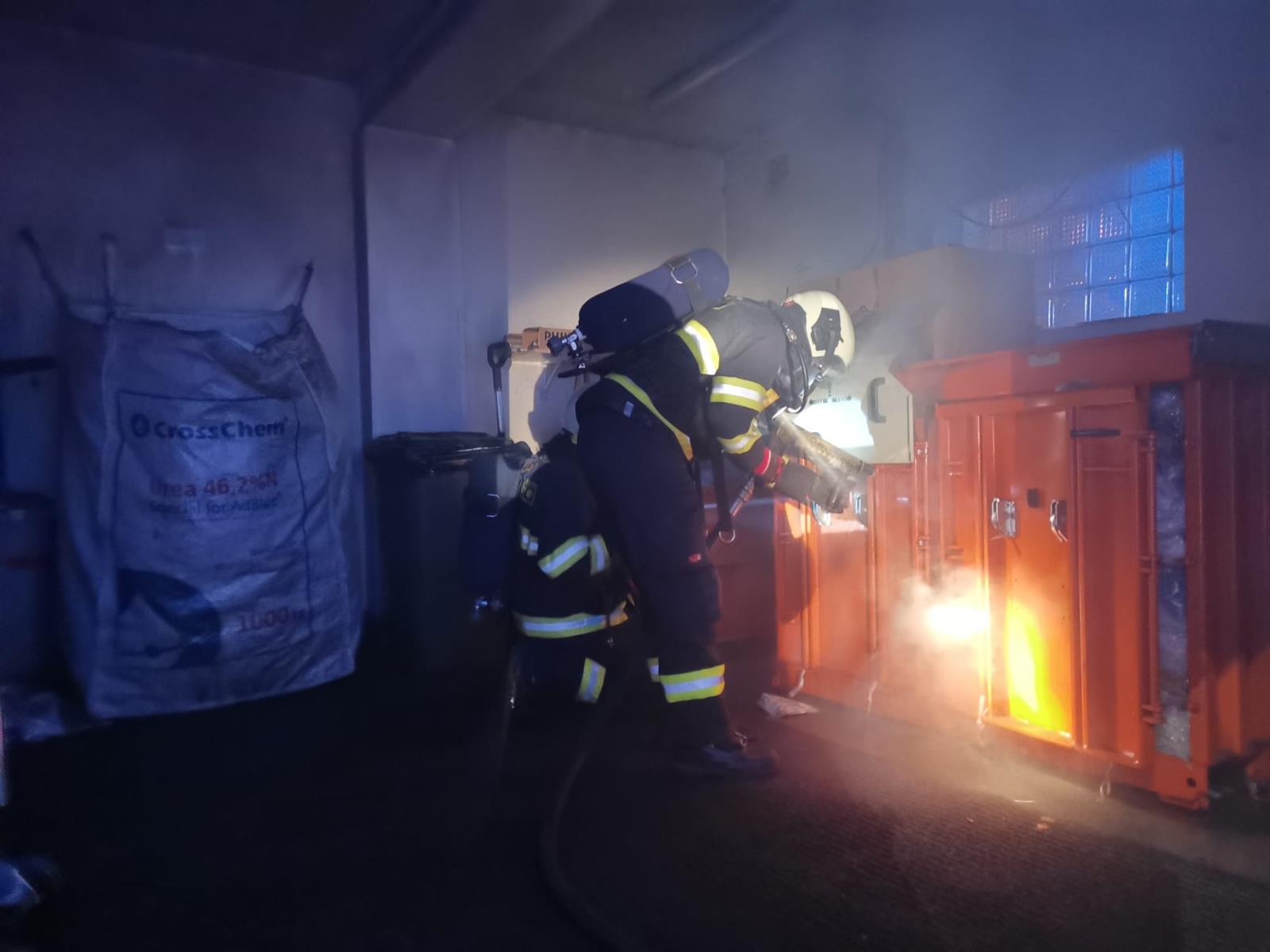 Po příjezdu na místo zásahu hasiči průzkumem zjistili, že se jedná o venkovní volně stojící sklad, ve kterém hoří lis na plastový a papírový odpad. Jednotka vnikla do skladu a provedla lokalizaci a následnou likvidaci požáru pomocí jednoho vysokotlakého proudu. Aby hasiči mohli dále ze zásobníku vyndat a dohasit hořící papíry, museli na otevření zásobníku použít hydraulický rozpínák.