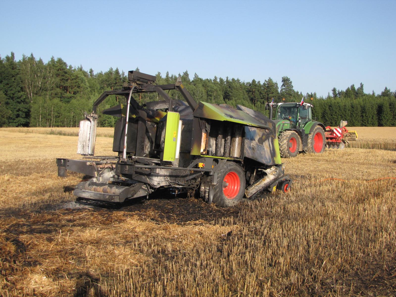 Škodu ve výši 1 500 000,- způsobil požár, který na poli u Kaplice, části obce Žďár zničil balíkovací stroj.