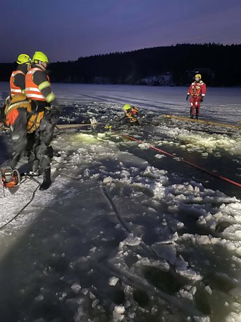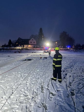 U zamrzlé hladiny zasahovali profesionální i dobrovolní hasiči kvůli potopené čtyřkolce. Stroj skončil několik metrů od břehu a jeho vyproštění vyžadovalo technický zásah a práci na ledu.