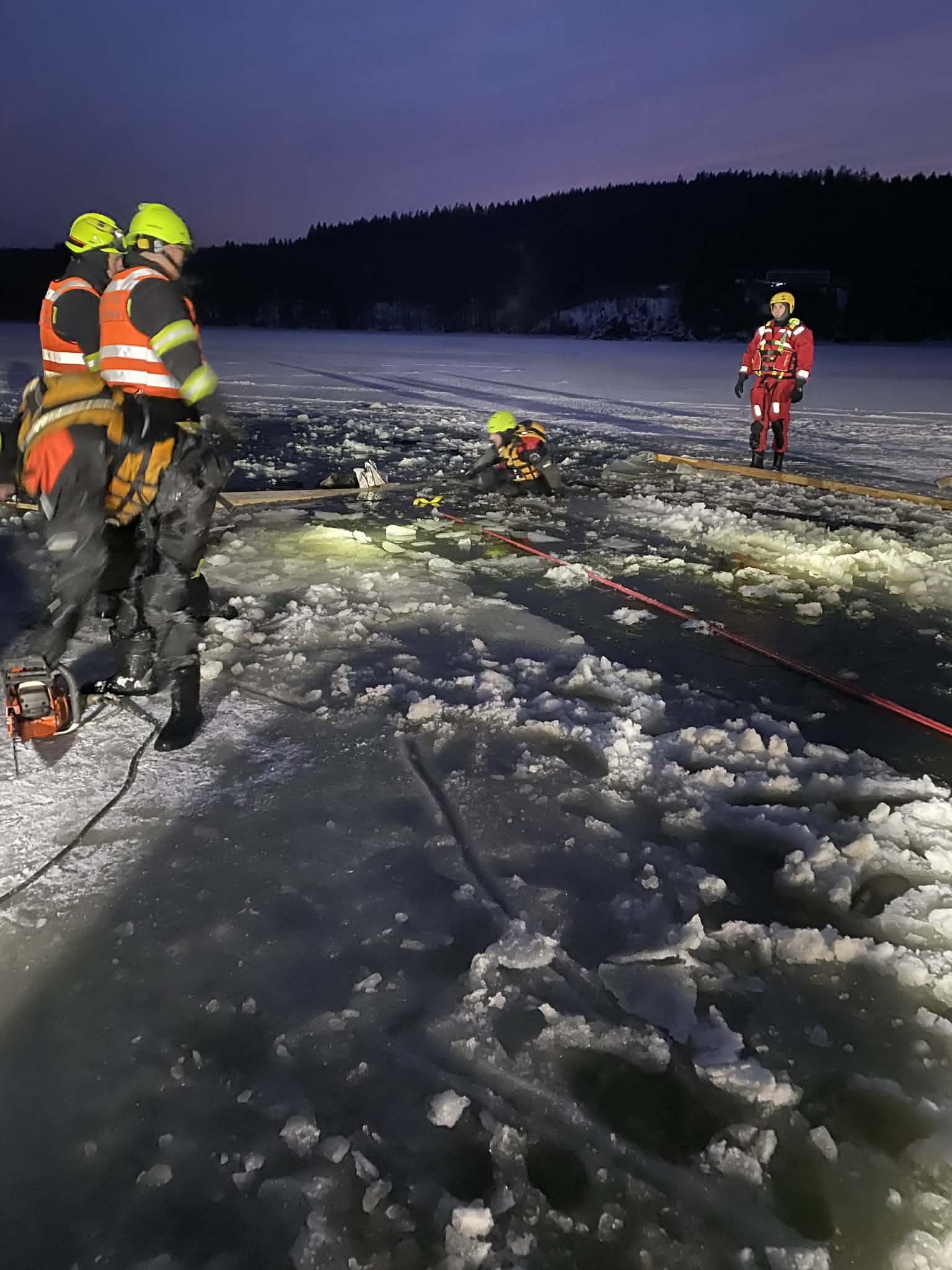 Na místě zasahovali dobrovolní hasiči a profesionální jednotka z Frymburku. Čtyřkolka se nacházela přibližně padesát metrů od břehu v místě u přívozu ve Frymburku a byla potopena v hloubce zhruba čtyř metrů. Hasiči museli nejprve vytvořit bezpečný přístup k místu zásahu. Led na hladině byl proto postupně prořezáván směrem ke břehu tak, aby bylo možné techniku bezpečně zajistit a připravit na vytažení.