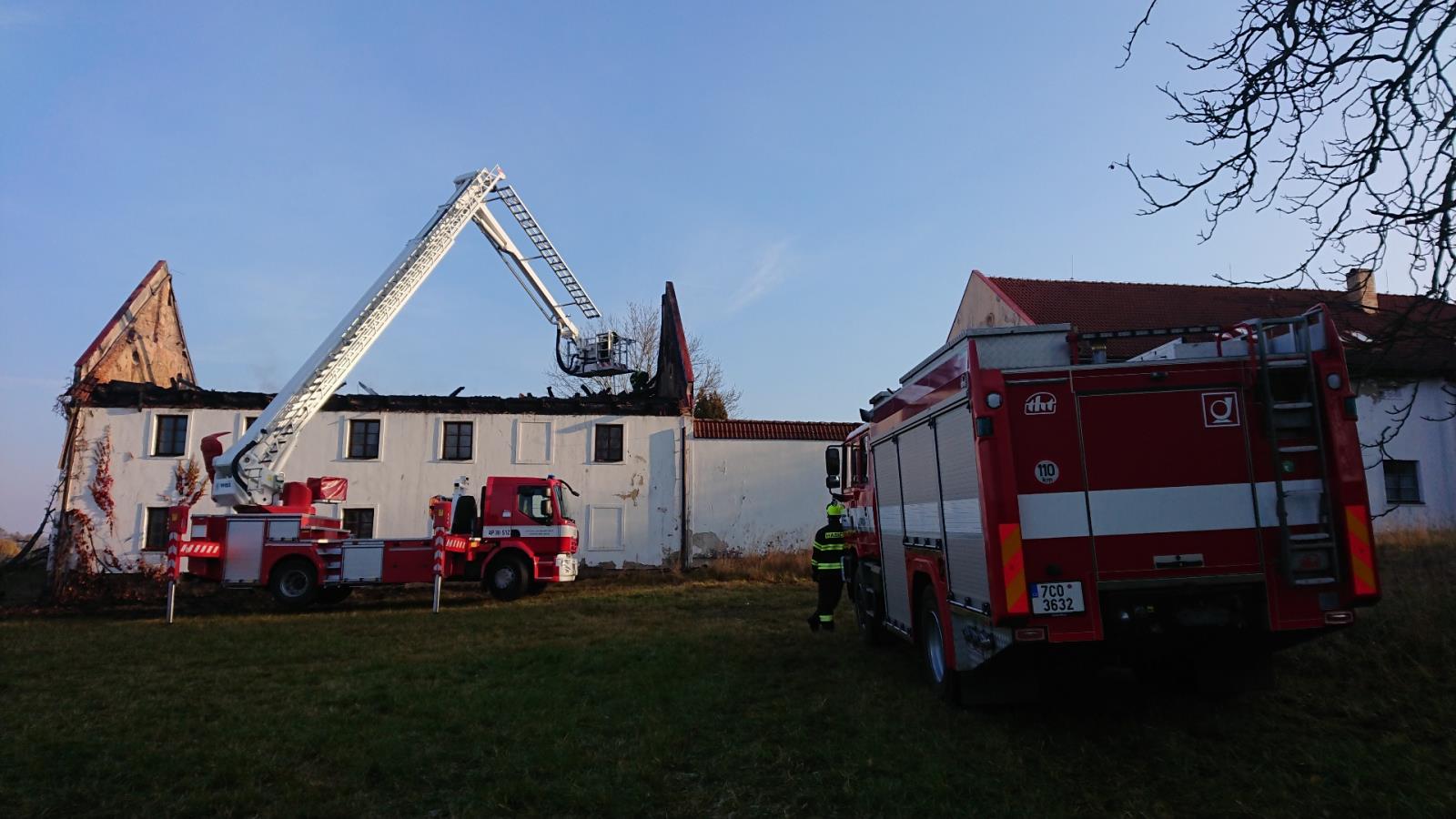 Ranní průzkum (v sobotu 30. října) za přítomnosti řídícího důstojníka HZS Jihočeského kraje ukázal nutnost vyžádání speciální techniky. V rámci mezikrajské výpomoci byl povolán ze Záchranného útvaru HZS ČR z Jihlavy pásový účelový automobil.Tím byla ohořelá střešní konstrukce postupně rozebrána. Zabránilo se tak jejímu propadnutí a především se tím vytvořilo bezpečné místo pro zásah hasičů. Ti pak dohasili poslední ohniska.