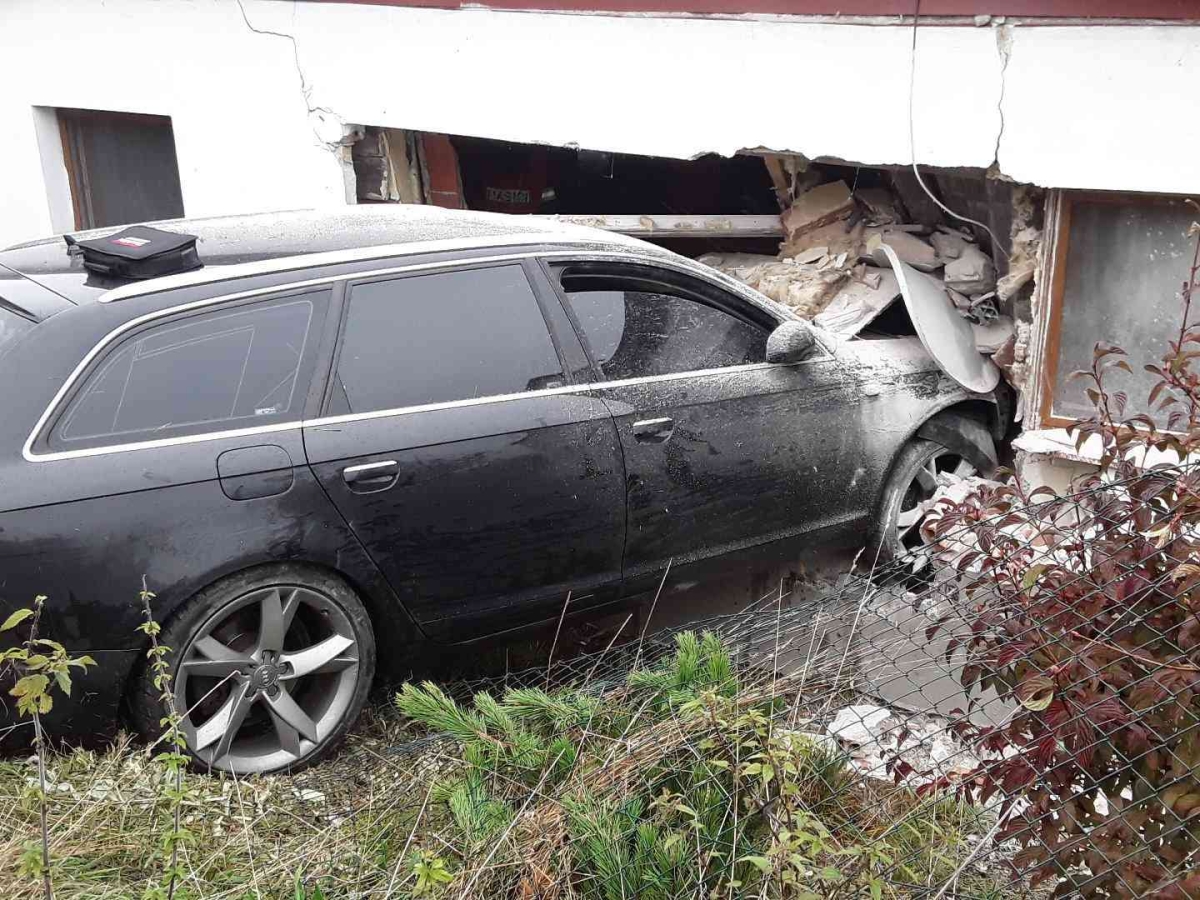 Audi se při nehodě probouralo až do obývacího pokoje