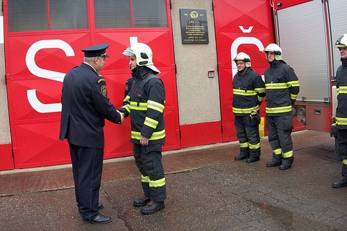Ředitel HZS Jihomoravského kraje plk. Jiří Pelikán a starosta města Slavkov u Brna Michal Boudný dnes ocenili příkladné chování...