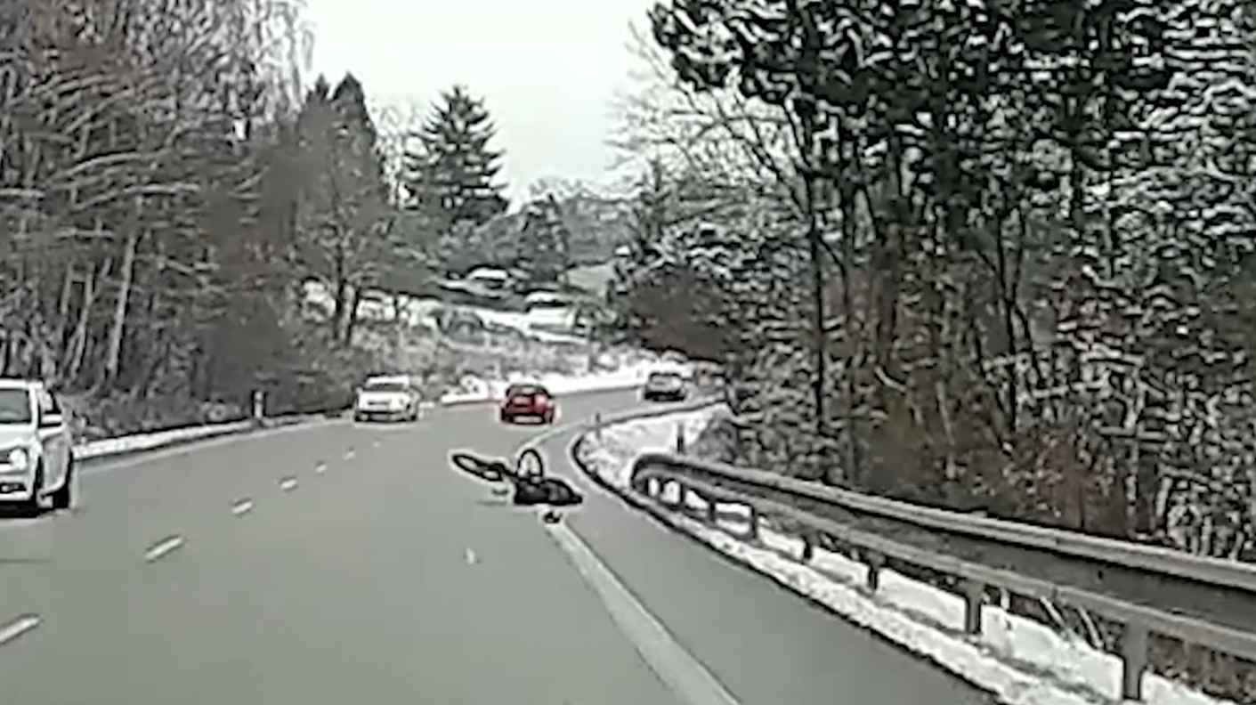 Podle videozáznamu se cyklistovi během jízdy zamotala taška do předního kola. Následkem toho se kolo prudce zablokovalo, muž ztratil rovnováhu a byl vymrštěn přes řídítka. Dopadl tvrdě na vozovku, ale díky rychlé reakci kolemjedoucího řidiče byla přivolána pomoc. Cyklista byl transportován k lékařskému ošetření, zranění byla naštěstí lehká.