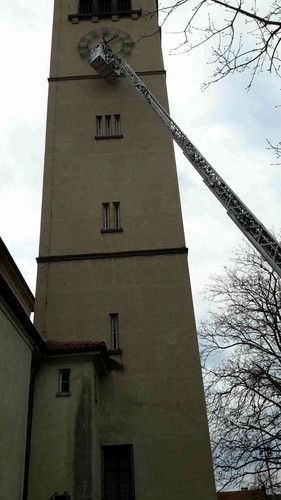 odstranili uvolněnou číslici z ciferníku hodin na věži kostela v Brně-Židenicích.