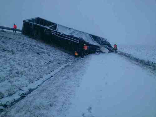 Největší komplikace zřejmě způsobila nehoda na 235.km D1 ve směru na Prahu, kde kamion vyjel z dálnice. Nikdo se při tom nezranil.