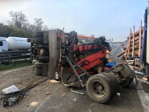 uzavřela jízdní pruhy ve směru na Prahu. Jeden nákladní automobil skončil po střetu na boku, z druhého jsme museli vyprostit zaklíněného řidiče. Zásah komplikovaly uvolněné klády.