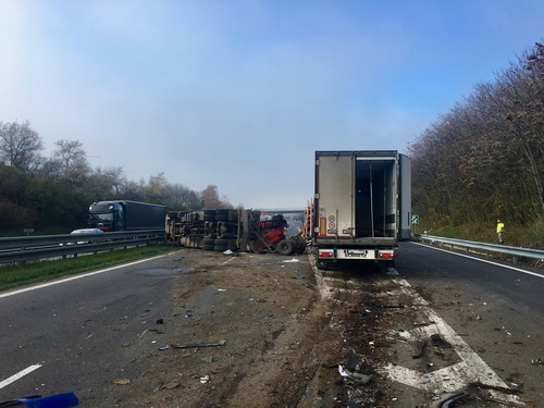 Dopravní nehoda tří kamionů na 207. km dálnice D1 na dlouhé hodiny  ve čtvrtek, 16. listopad 2017