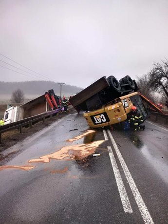 Profesionální hasiči ze stanic Brno - Přehrada, Tišnov a Rosice vyjeli v pátek odpoledne k dopravní nehodě. Po příjezdu na místo zjistili, že se jedná o nákladní automobil s přívěsem převážejícím bagr. Řidič byl nezraněn a opustil havarovanou kabinu svépomocí.