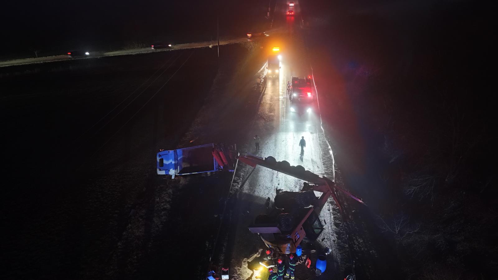 V pátek 6. února 2026 před šestnáctou hodinou došlo k dopravní nehodě nákladního automobilu s přívěsem, který převážel bagr, na silnici č. 385 mezi Kuřimí a Čebínem. Řidič vyvázl bez zranění. Hasiči zajistili vozidlo, omezili únik provozních kapalin a asistovali při odstraňování následků havárie.