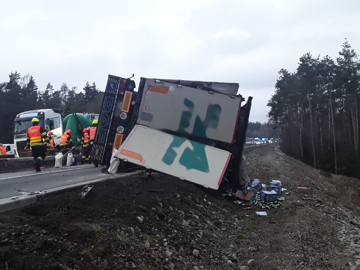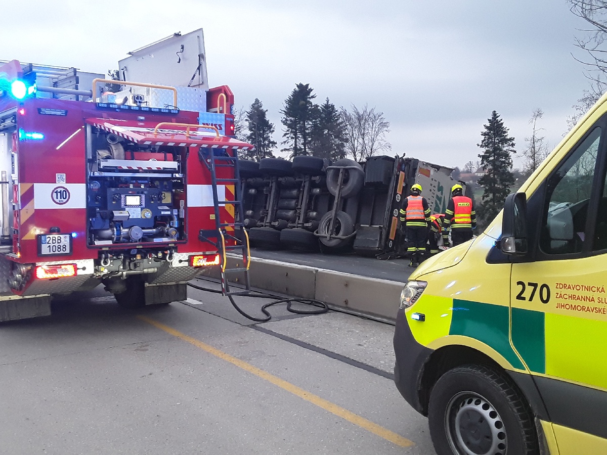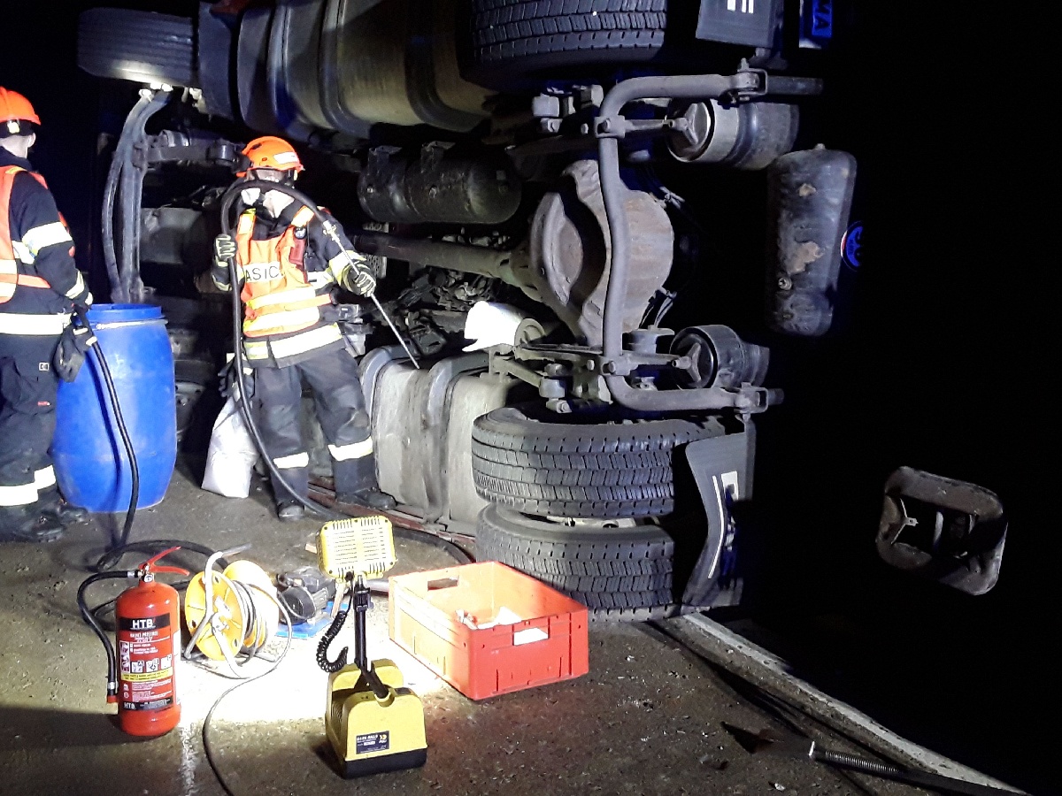 Krátce po 19. hodině přijalo operační středisko informaci o převráceném kamionu v dopravním omezení na 169. km D1. Příjezd na místo byl vzhledem k dopravnímu omezení a provozu náročný. Hasiči po příjezdu zjistili, že se při nehodě zranil řidič kamionu, který skončil v péči posádky ZZS. Provoz na dálnici byl obousměrně uzavřen. Z převráceného kamionu bylo nutné odčerpat 150 litrů nafty. Po půl desáté večer ukončily jednotky na místě nehody svoji činnost. Následky bude dále odstraňovat specializované firma. Provoz na dálnici zůstal v době odjezdu našich jednotek stále uzavřený.