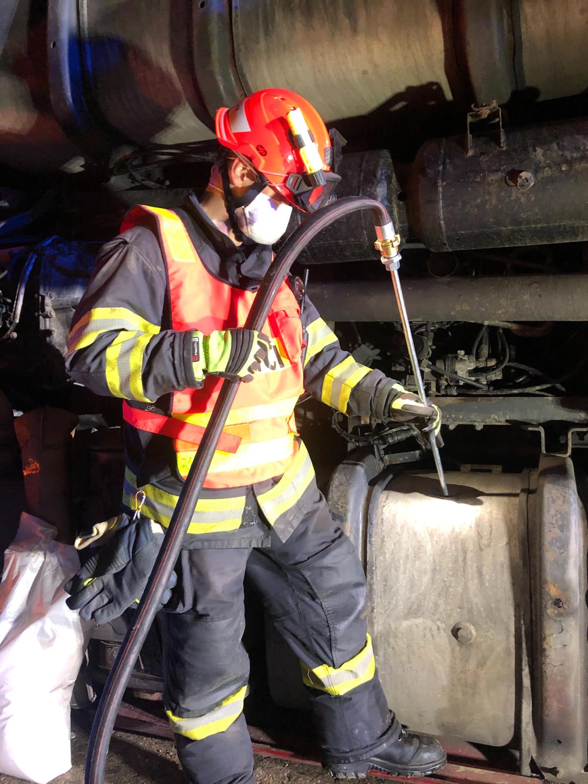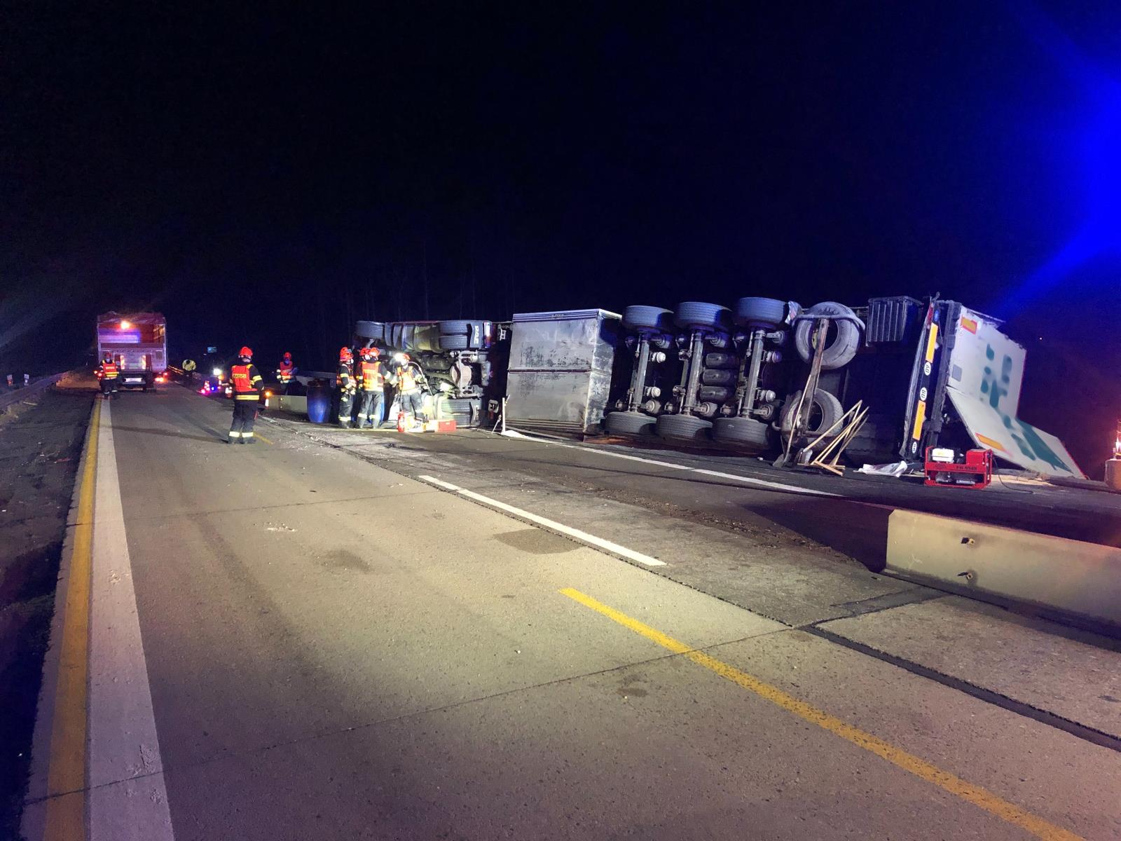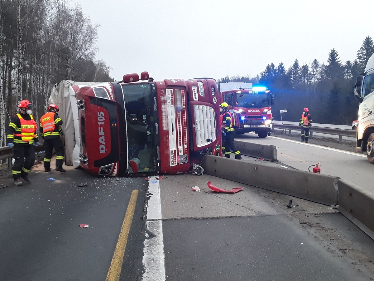 Krátce po 19. hodině přijalo operační středisko informaci o převráceném kamionu v dopravním omezení na 169. km D1. Příjezd na místo byl vzhledem k dopravnímu omezení a provozu náročný. Hasiči po příjezdu zjistili, že se při nehodě zranil řidič kamionu, který skončil v péči posádky ZZS. Provoz na dálnici byl obousměrně uzavřen. Z převráceného kamionu bylo nutné odčerpat 150 litrů nafty. Po půl desáté večer ukončily jednotky na místě nehody svoji činnost. Následky bude dále odstraňovat specializované firma. Provoz na dálnici zůstal v době odjezdu našich jednotek stále uzavřený.
