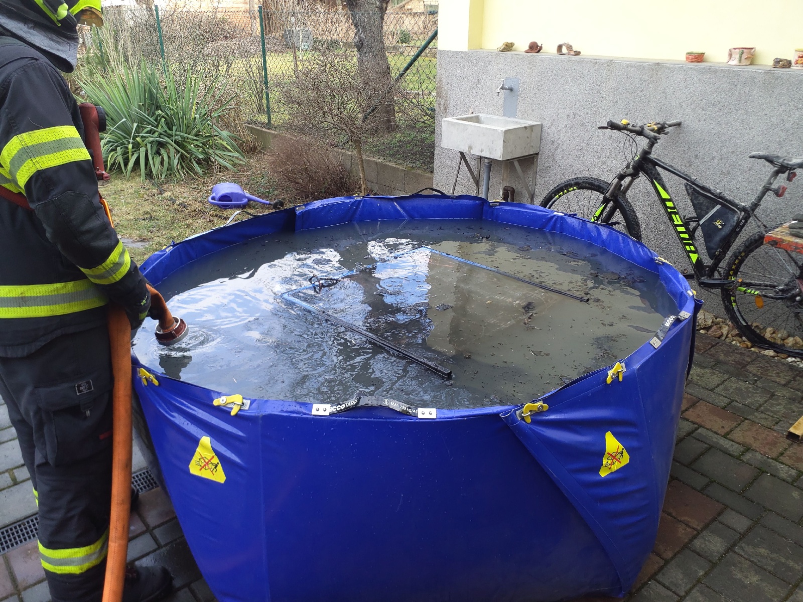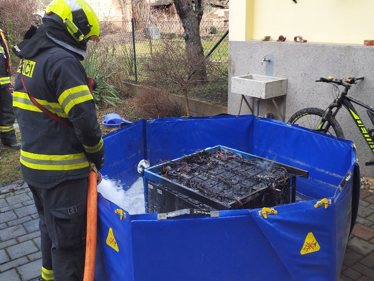 Hasiči odpojili vozík s bateriemi od systému, aby bylo možné jej dostat ze suterénu před dům a umístili ho do vodou naplněné skládací nádrže. Před desátou hodinou jsme činnost v místě zásahu ukončili. Ve večerních hodinách se vrátí naše posádka zkontrolovat stav baterií.