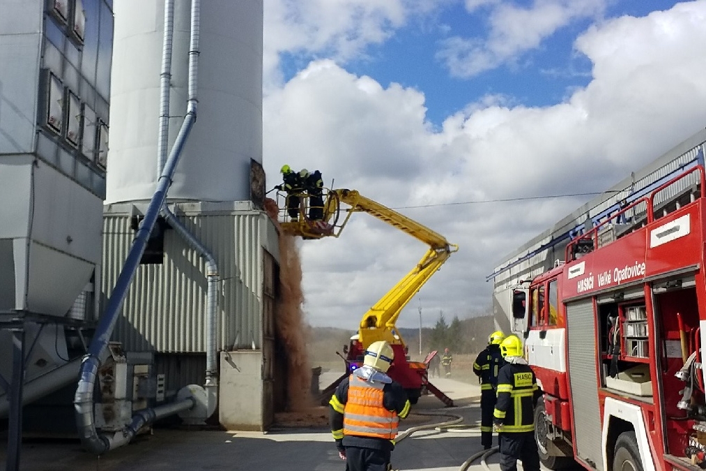 Pondělí, 3. dubna 2023 - Po jedenácté hodině jsme přijali na tísňovou linku oznámení, že ve Velkých Opatovicích hoří piliny. Hořely uvnitř sila, takže jsme museli zásobník vyprázdnit. Hořící piliny jsme následně prolévali vodou. Požár jsme zlikvidovali po osmnácté hodině, kdy už bylo silo vyprázdněno. Před devatenáctou hodinou jsme zásah ukončili.