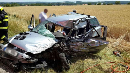 Hasiči ze znojemské stanice dnes, 22.června 2017, odpoledne ve spolupráci se ZZS vyprošťovali zraněného řidiče po střetu dvou...