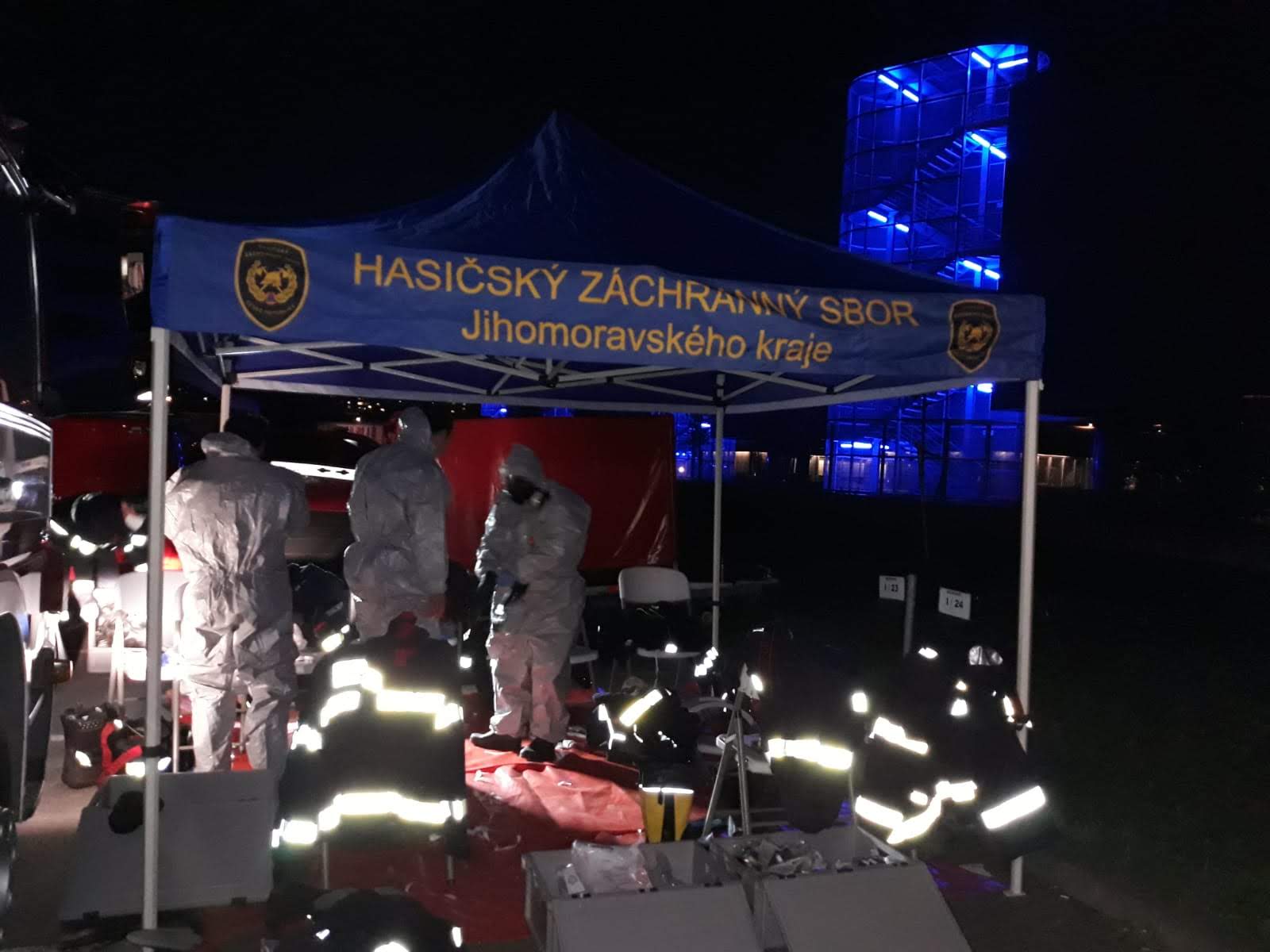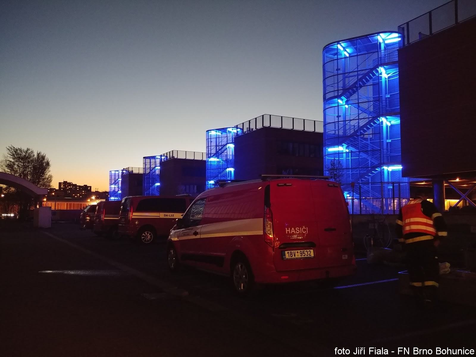 Neděle, 19. dubna 2020 – V neděli po 20. hodině jsme zahájili plánovanou preventivní dezinfekci v části Fakultní nemocnice Brno-Bohunice. Na místě několik hodin pracovalo 15 hasičů ze stanice Brno-Líšeň, která se specializuje na zásahy s nebezpečnými látkami.