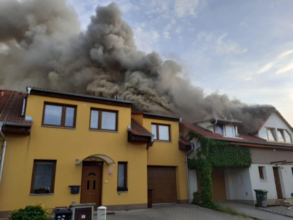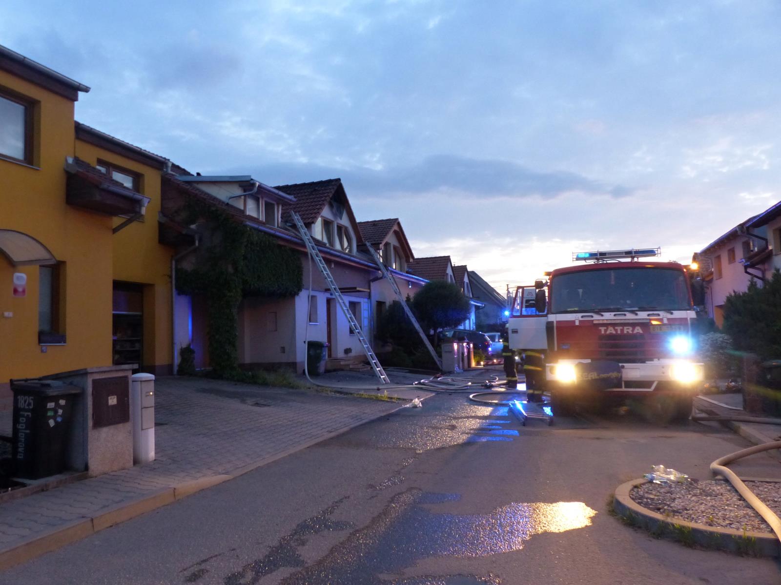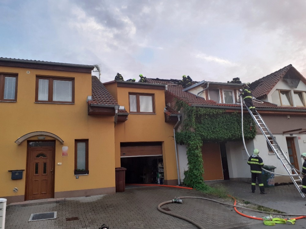 Před dvacátou hodinou vyjely profesionální jednotky ze stanic Tišnov, Přehrada, Lidická, Líšeň a dobrovolné jednotky z Kuřimi a Lelekovic na ulici Foglarova v Kuřimi. Zde hořela střecha řadového rodinného domu. Hasiči po svém příjezdu zahájili okamžitě hašení a poskytli první pomoc uživateli domu, který se nadýchal zplodin hoření. Celkem čtyřmi vodními proudy dostali požár pod kontrolu ve 20:26 hod. Zasahující dále rozebírali požárem poškozenou střešní konstrukci a vyhledávali skrytá ohniska. Likvidaci požáru ohlásil velitel před 22. hodinou. Na místě zůstává na dohled místní dobrovolná jednotka.