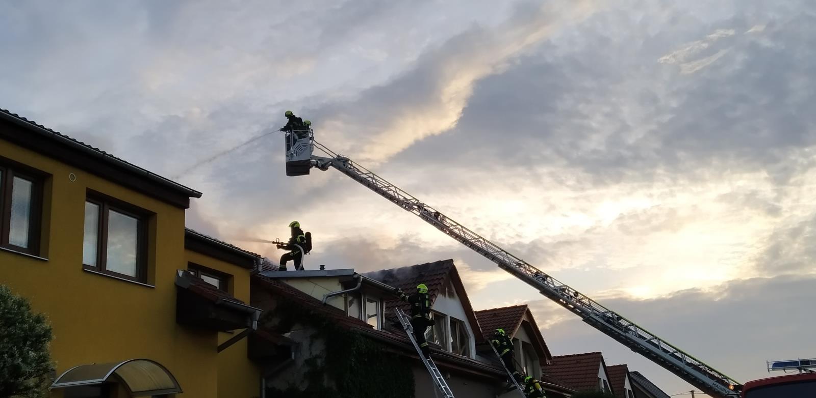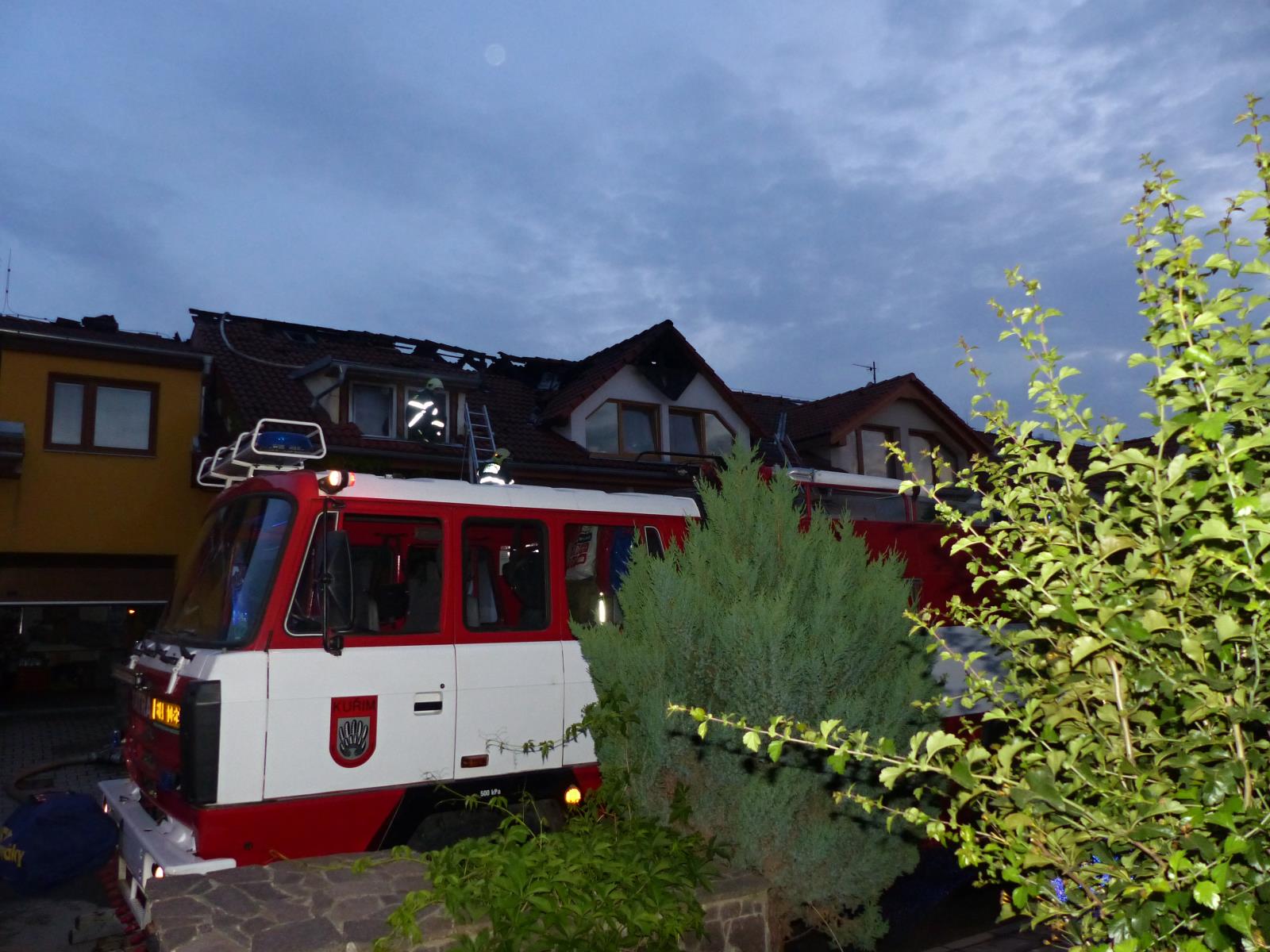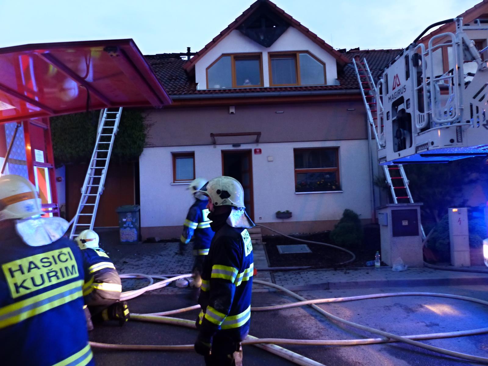 Před dvacátou hodinou vyjely profesionální jednotky ze stanic Tišnov, Přehrada, Lidická, Líšeň a dobrovolné jednotky z Kuřimi a Lelekovic na ulici Foglarova v Kuřimi. Zde hořela střecha řadového rodinného domu. Hasiči po svém příjezdu zahájili okamžitě hašení a poskytli první pomoc uživateli domu, který se nadýchal zplodin hoření. Celkem čtyřmi vodními proudy dostali požár pod kontrolu ve 20:26 hod. Zasahující dále rozebírali požárem poškozenou střešní konstrukci a vyhledávali skrytá ohniska. Likvidaci požáru ohlásil velitel před 22. hodinou. Na místě zůstává na dohled místní dobrovolná jednotka.