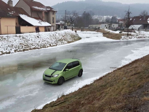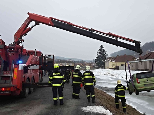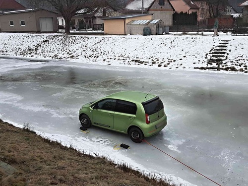 Vůz skončil po nehodě na zamrzlé řece. K vytažení menšího osobního automobilu z koryta řeky povolal velitel zásahu speciální vyprošťovací automobil ze stanice Lidická v Brně.